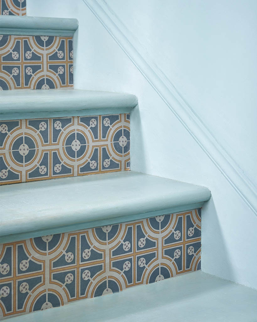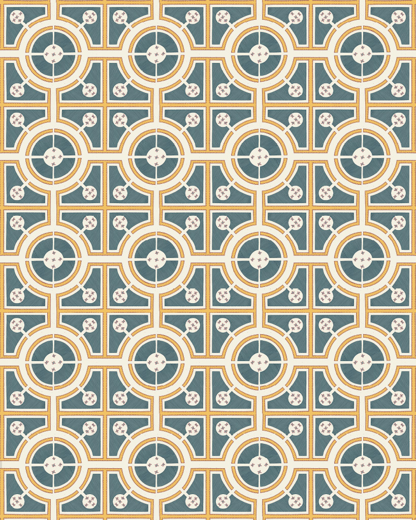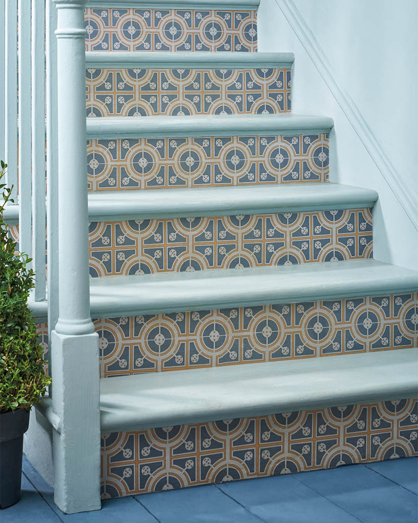 Gedruckt für Thomas Pierrepoint. Für dieses Design aus Kreisen und Quadraten wurde Aubusson Blue sowie die Chalk Paint™ Farbe Tilton verwendet – eine Farbkombination, die an portugiesische Fliesen erinnert.