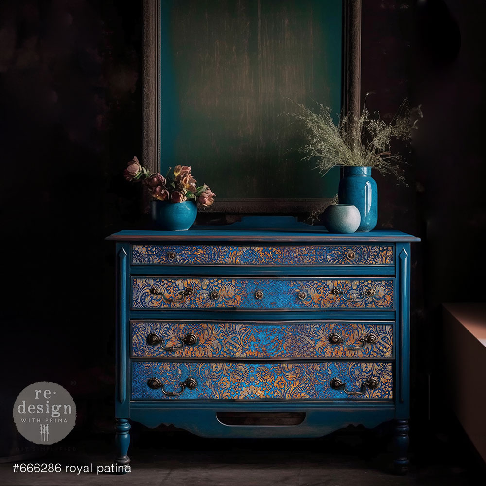 Das neue A1-Decoupage-Papier "Royal Patina" von Redesign with Prima® zeichnet sich durch tiefe, satte Blautöne und schablonierte Patina aus, die eine bezaubernde Ästhetik erzeugen. Dieses Decoupage-Papier erzeugt die Illusion eines atemberaubenden 3D-Effekts, der Ihren Projekten Tiefe und Dimension verleiht und gleichzeitig ein Gefühl von Königlichkeit und Antike he
