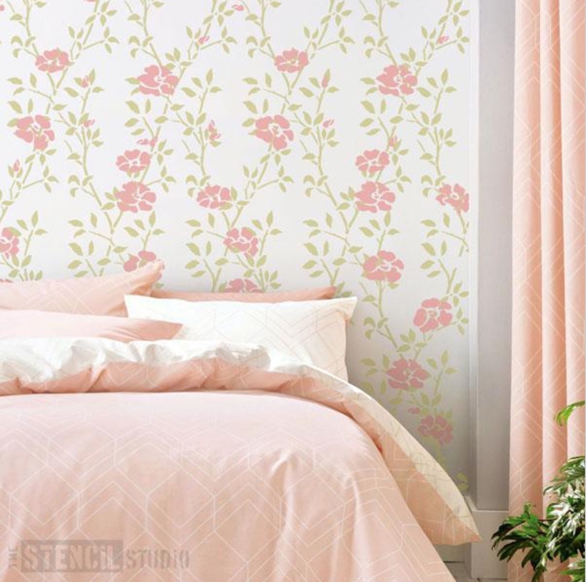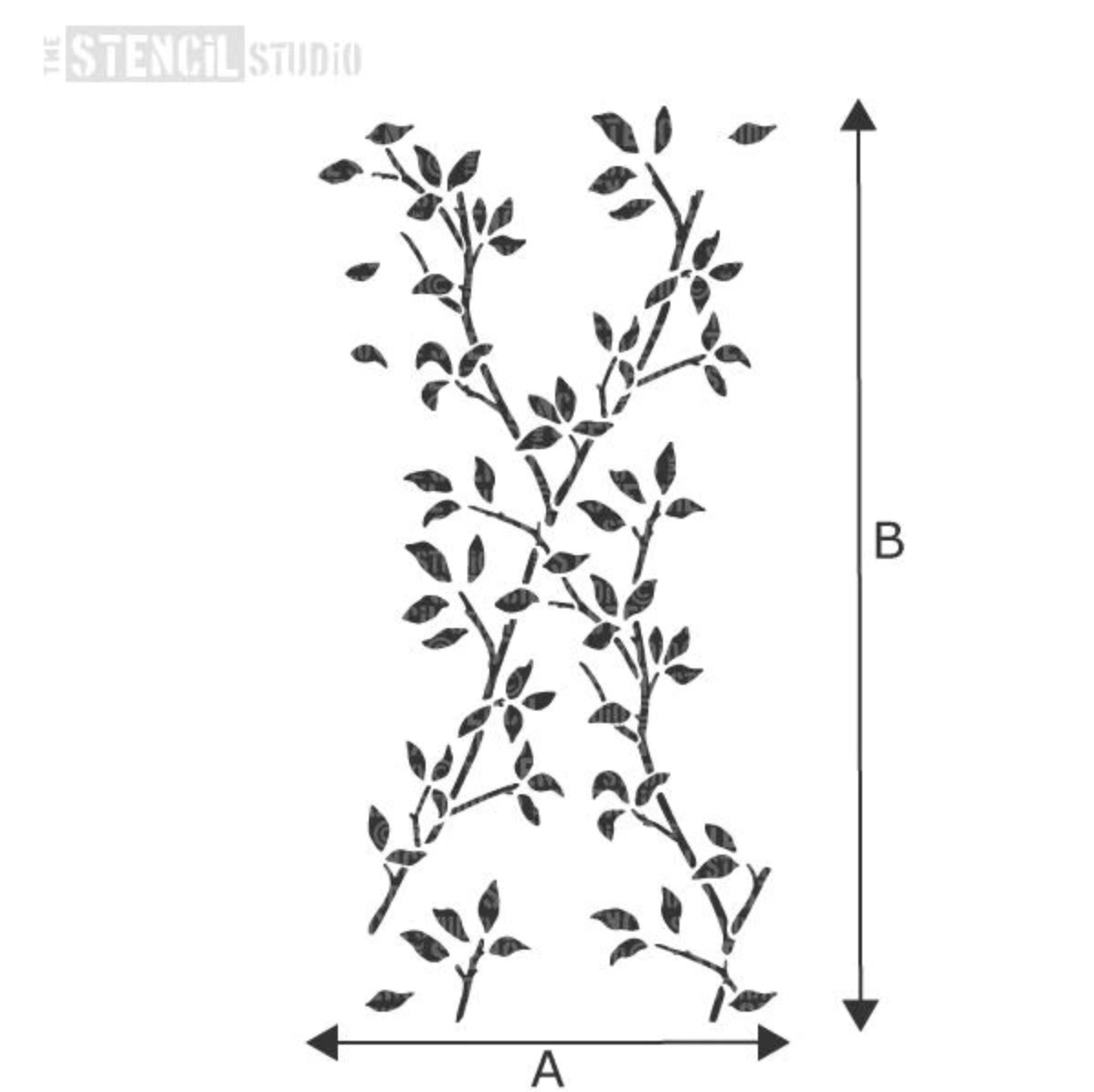 Blätter und feine, detaillierte Zweige bilden dieses schöne, sich wiederholende Schablonenmuster mit Rosen. Wiederholen Sie zuerst das Blattspalier und fügen Sie dann die Rosen hinzu, wo immer Sie möchten, um ein Geflecht von Kletterblumen zu schaffen.