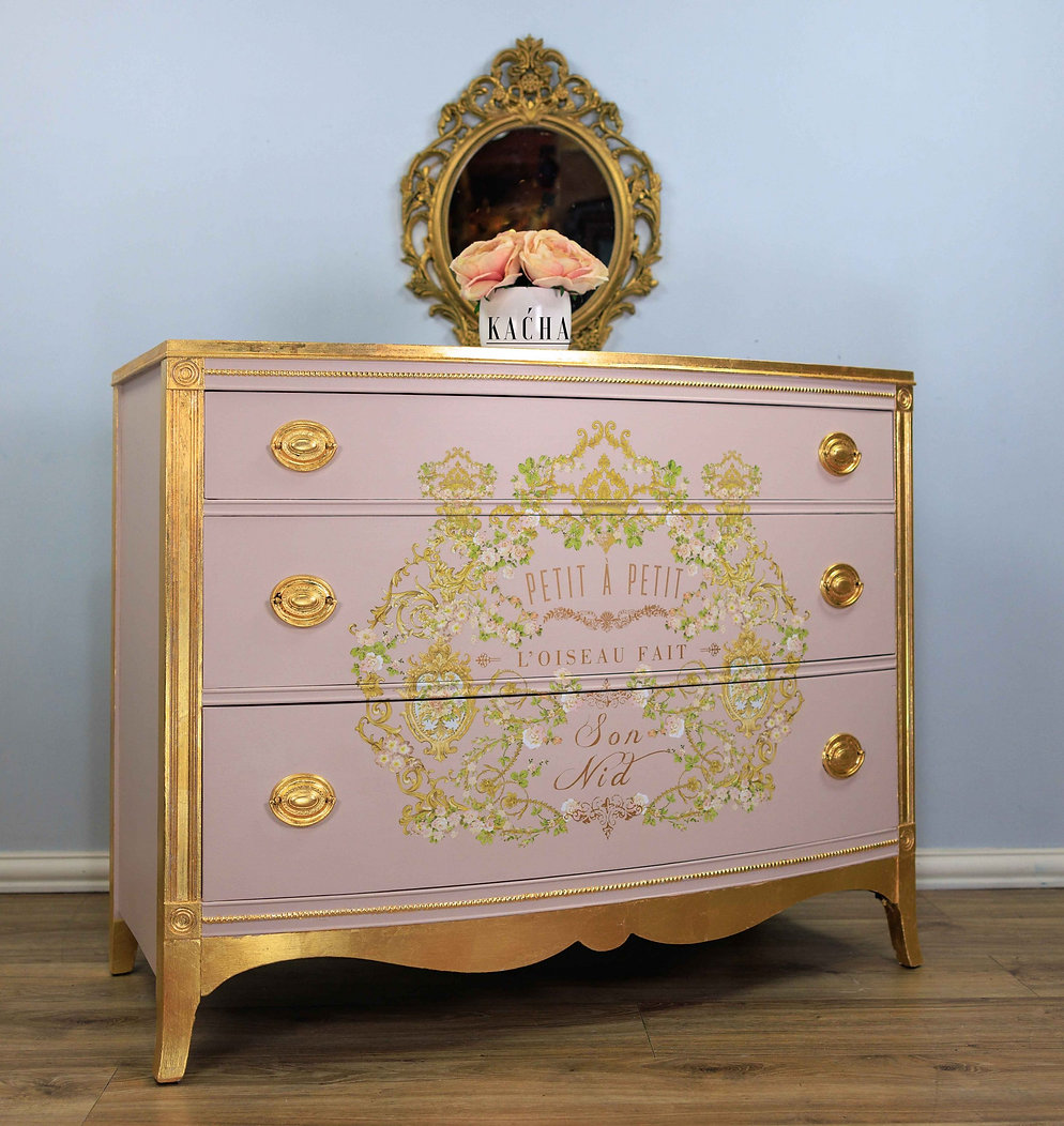 Inspiriert durch Marie Antoinettes Zimmertapete in Versailes beeindruckt die Transferfolie in glänzendem Gold, zartem Rose und frischem Grün.