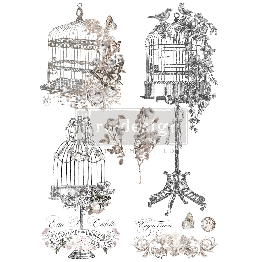 Liebhaber von Vogelkäfigen können sich freuen! Dieses Decor Transfer® zeigt wunderschöne Vogelkäfige in verschiedenen Stilen.
