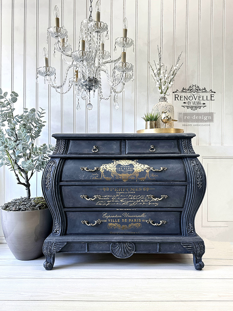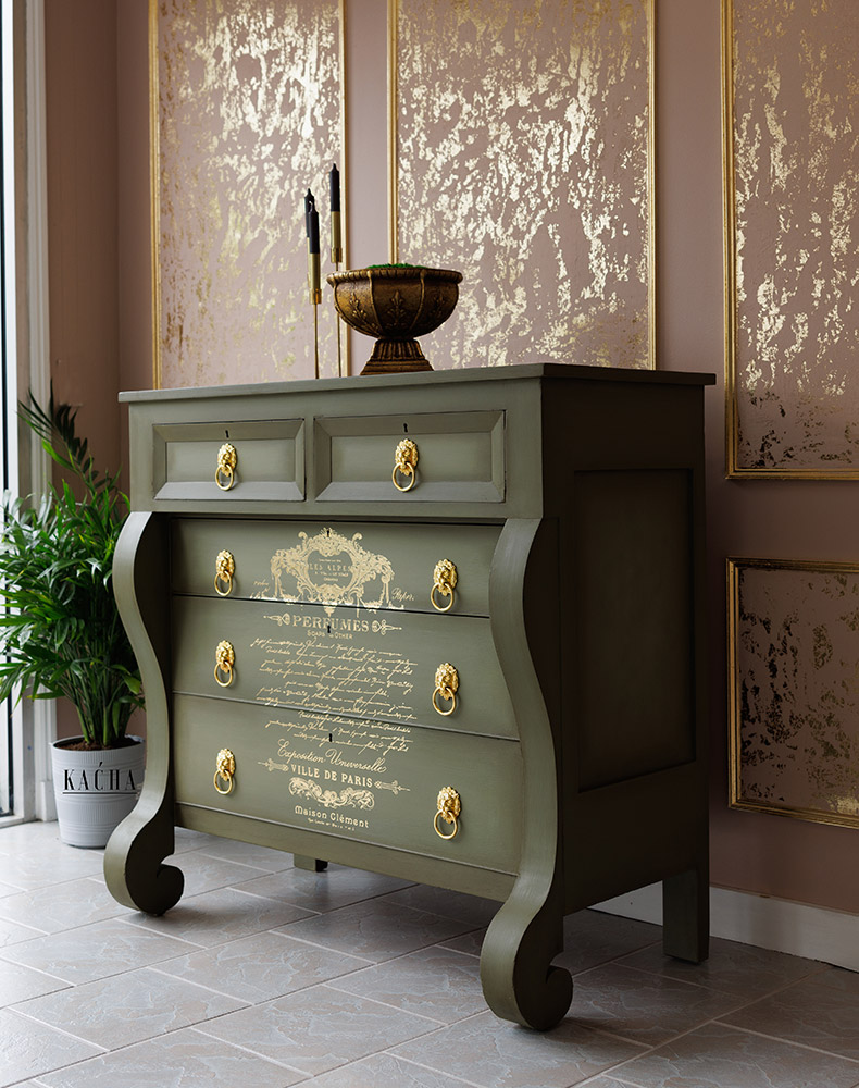 Tipp! Erzielen Sie ganz einfach den Look einer Goldfolierung! Tragen Sie das Transfer einfach auf die gewünschte Oberfläche auf und reiben Sie es mit dem Redesign Transfer Tool an. Kacha empfiehlt, ihre Folientransfers mit einem klaren Wachs auf Wasserbasis oder Poly zu versiegeln. Testen Sie das Produkt immer zuerst. Das Ergebnis ist ein wunderschönes, glänzendes Goldfoliendesign, das jedem Raum einen Hauch von Glamour verleiht.