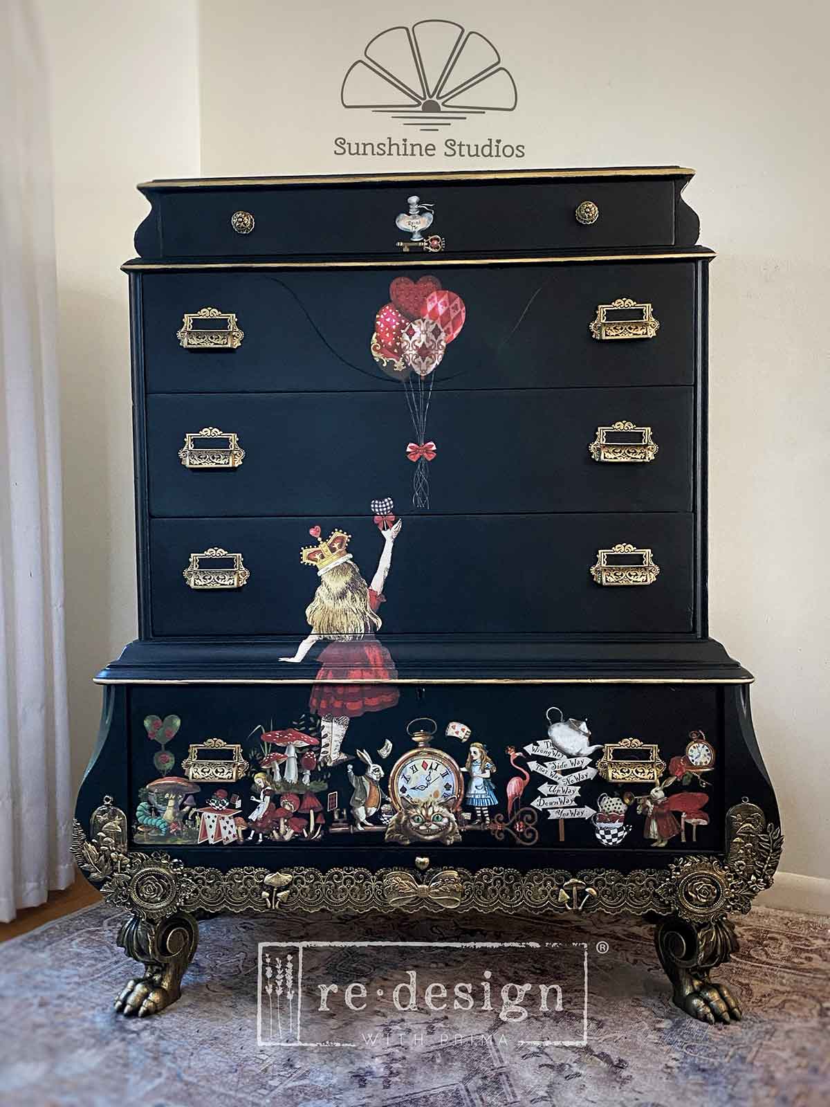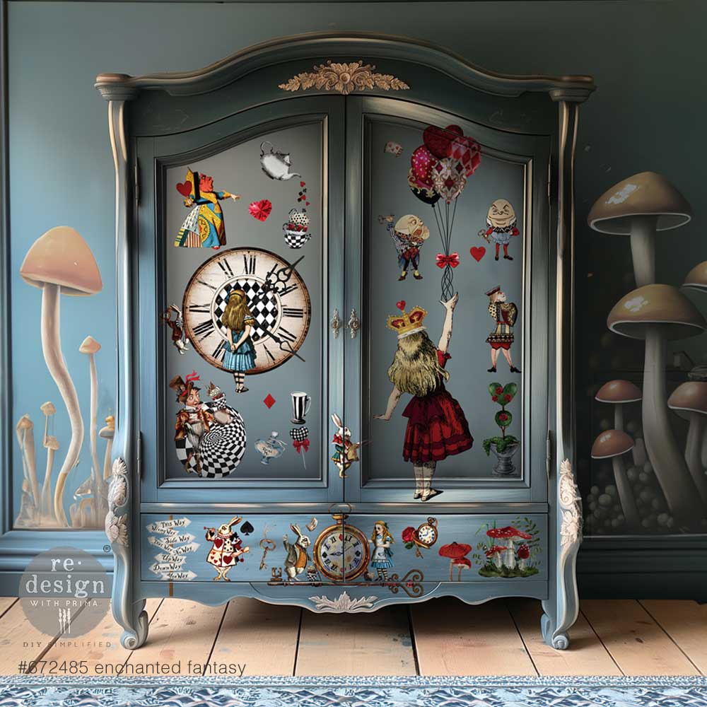 Stellen Sie sich einen klassischen Schrank vor, der mit dem verrückten Hutmacher, dem weißen Kaninchen und der Herzkönigin geschmückt ist, von denen jeder eine Geschichte zu Ihrer Einrichtung beiträgt.