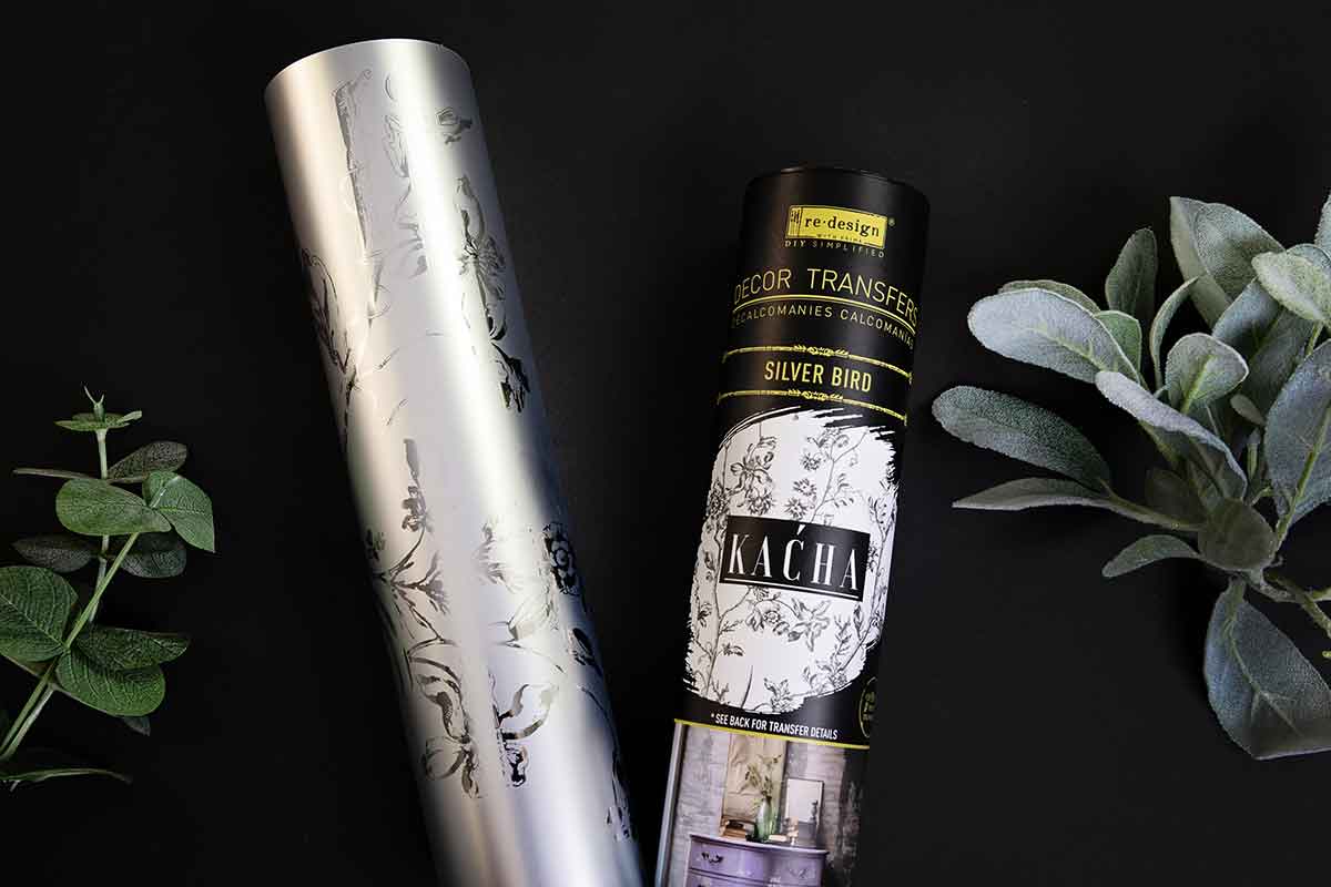 Dieses mit dem für Kacha typischen Hauch von Glamour entworfene Transfer zeigt anmutige Vögel auf zarten Zweigen, die alle in einer atemberaubenden Silberfolie dargestellt sind, die Ihren Möbeln eine luxuriöse, reflektierende Qualität verleiht.