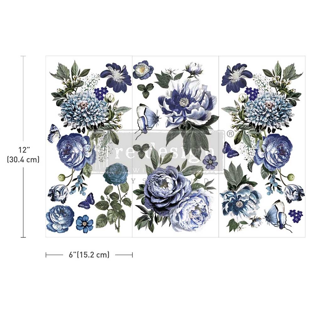 Markante indigoblaue Blüten, filigrane Blätter und flatternde Schmetterlinge vereinen sich zu einem Design, das sowohl dramatisch als auch raffiniert ist. Die tiefblauen Töne kombiniert mit zartem Grün machen dieses Transfer perfekt, um jedem Projekt eine luxuriöse und dennoch zeitlose Note zu verleihen.