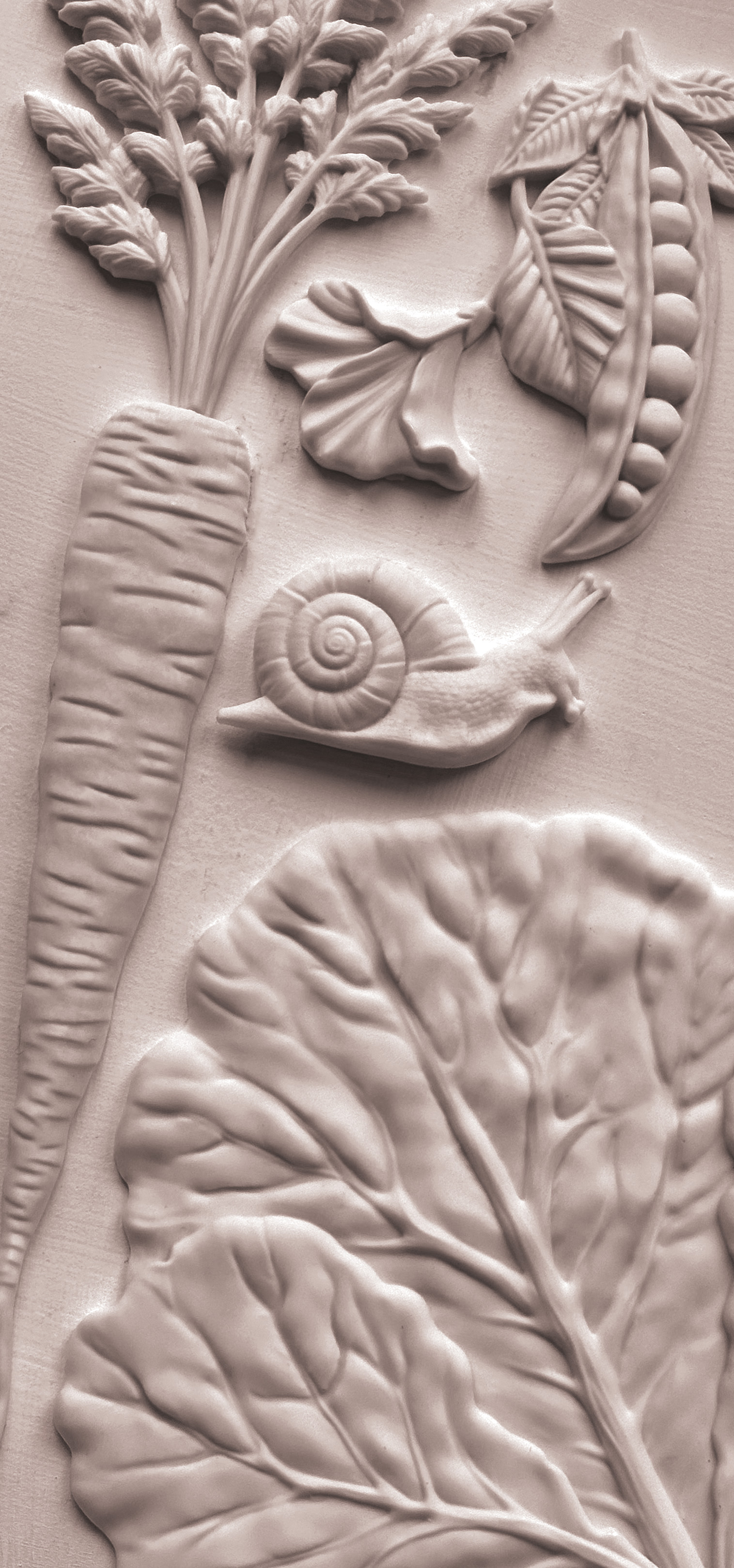 Das detailreiche Kohlblatt bildet das Herzstück dieser 6x10" Form und wird durch liebevoll gestaltete Frühlingsgemüse sowie eine kleine Schnecke ergänzt.