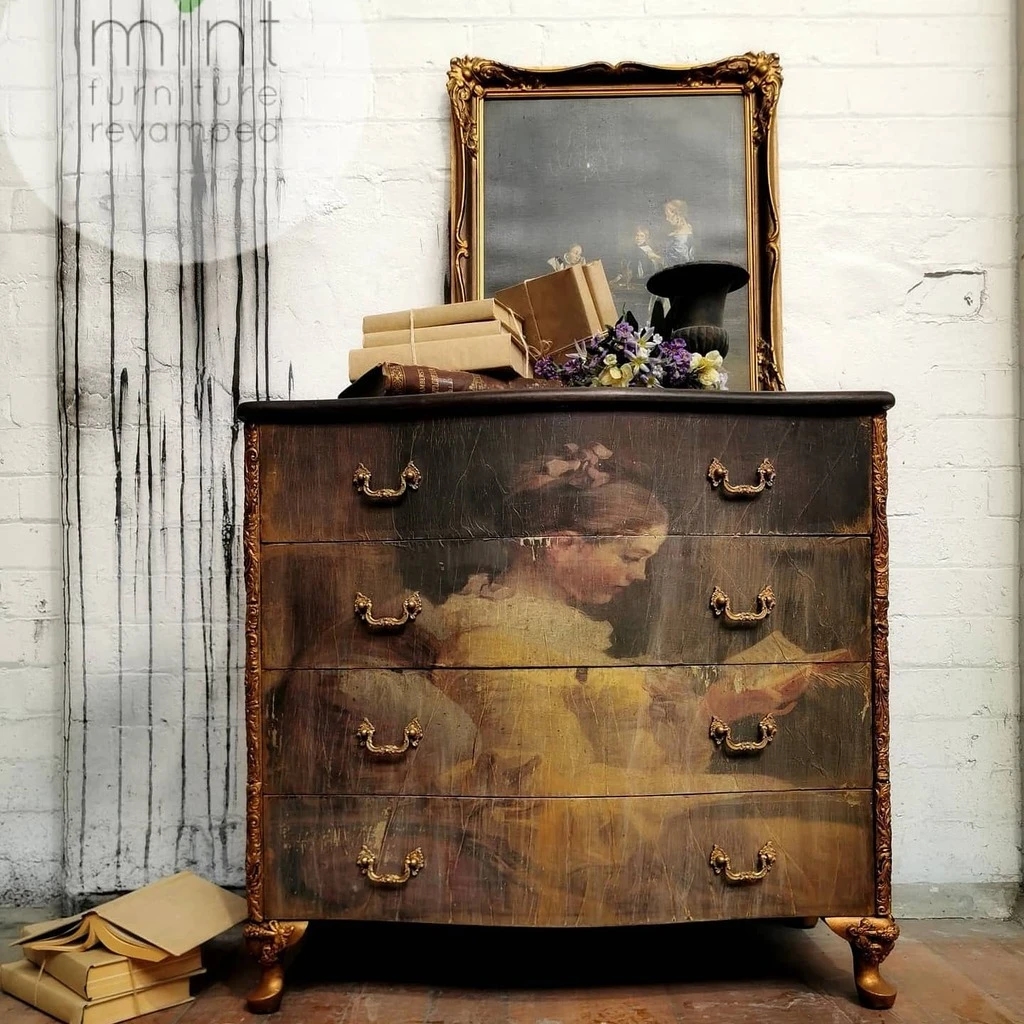 Die MINT-Decoupage-Papiere wurden speziell für die Möbelkunst und -renovierung entwickelt. Jedes Design ist in zwei Größen erhältlich, A1 und A3, und wird auf einem speziell für Decoupage ausgewählten Papier gedruckt.
