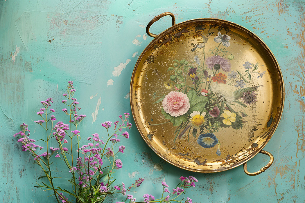 Stellen Sie sich einen Vintage-Wandkorb oder ein Zinngefäß vor, das mit üppigen Blumen und flatternden Insekten verziert ist, oder eine Galeriewand, die mit floralen Akzenten im Frühlingsstil erblüht.