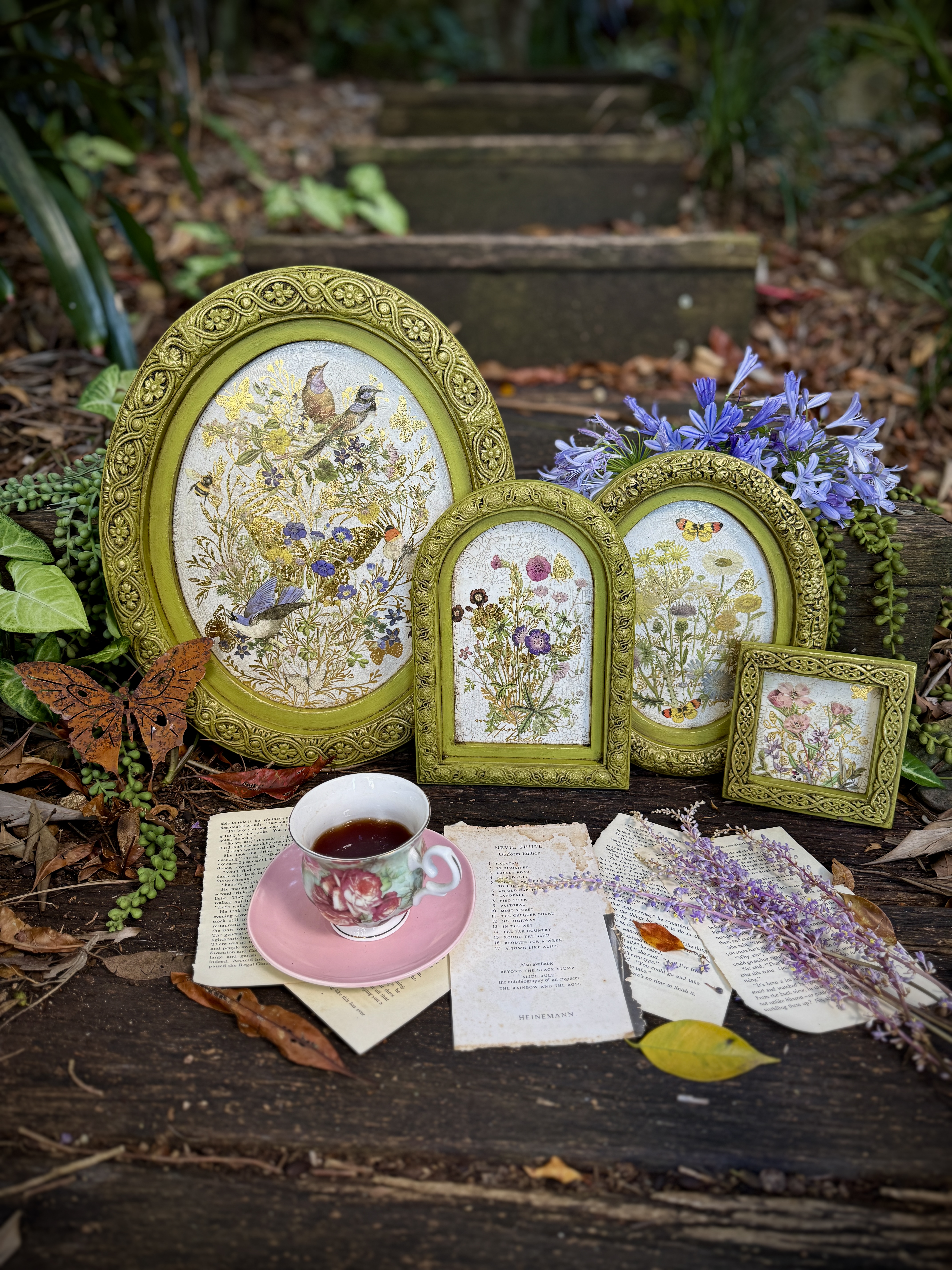 Inspiriert von einem zehnbändigen Meisterwerk der Botanik (1806–1840) kombiniert dieses 8x12" Transfer-Set filigrane Rahmen mit detailreichen floralen Studien im Stil von Jane Landon, bekannt für ihre präzisen und ausdrucksstarken Pflanzenillustrationen.