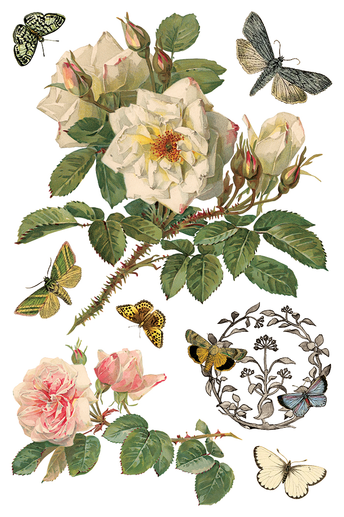 Das IOD Transfer-Pad „By Any Other Name“ präsentiert klassische Rosenmotive nach den Illustrationen von Paul De Longpré, ergänzt durch Vögel, Schmetterlinge und typografische Elemente.