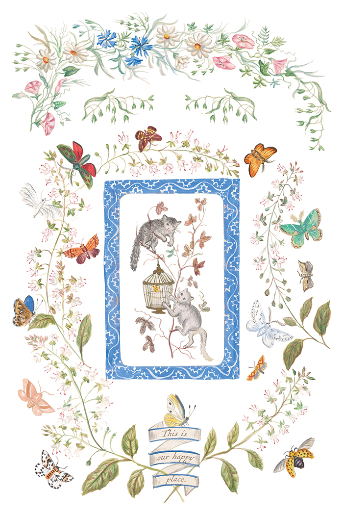 Die Motive stammen aus einem Familienalbum von 1868, das Miss Emily Clare Harvey mit liebevollen Bleistift- und Aquarellillustrationen rund um die Porträts ihrer Familie gestaltete.