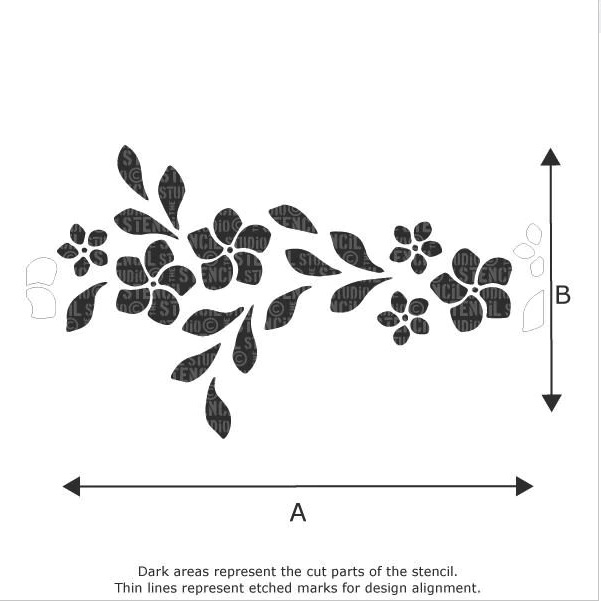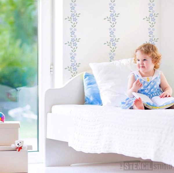 Wunderschöne, zarte Frangipani-Blüten und -Blätter bilden diese Schablonenumrandung. Wiederholen Sie die Schablone für Streifen und wählen Sie die Farben, die zu Ihrem Zimmer passen.