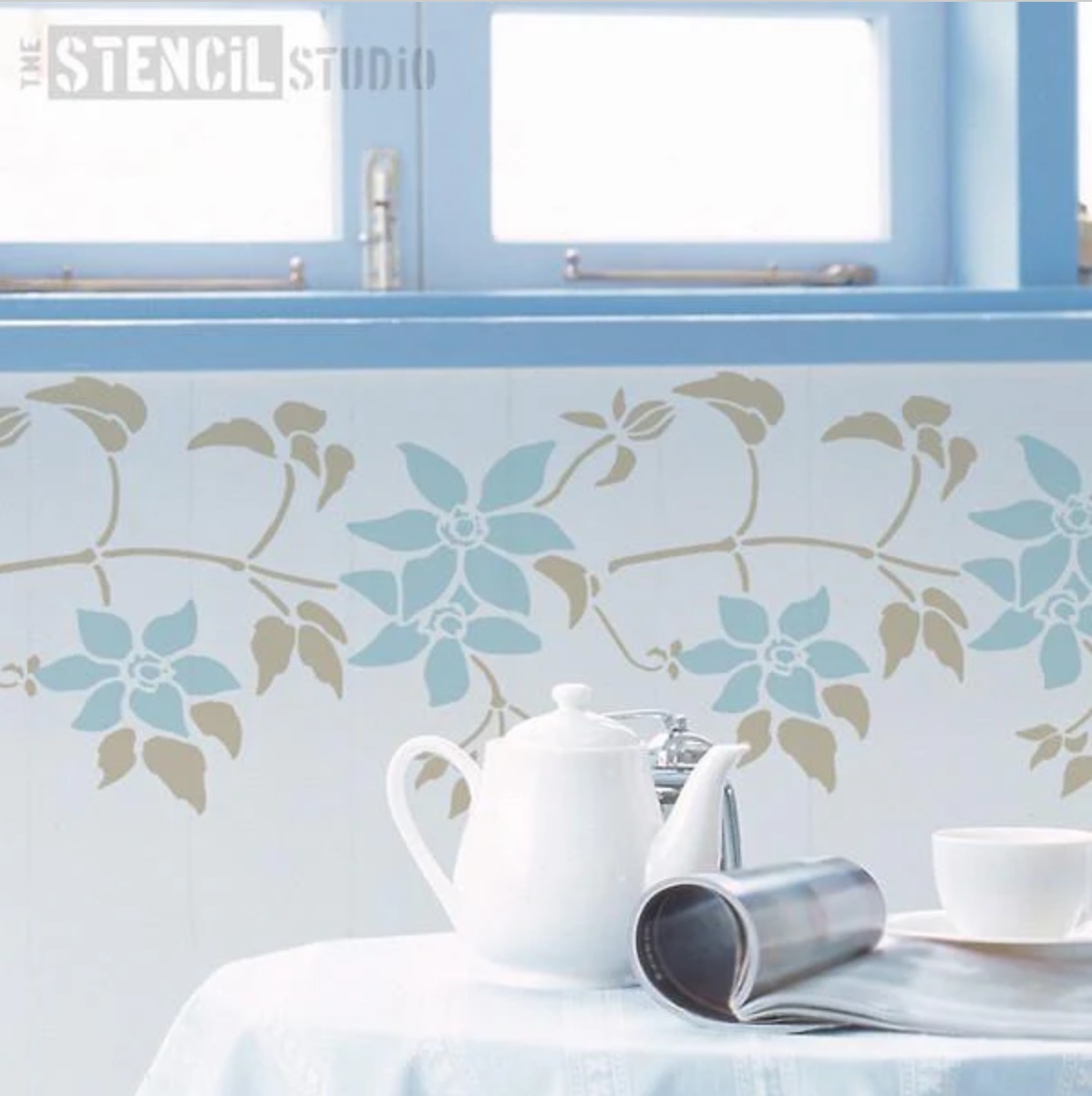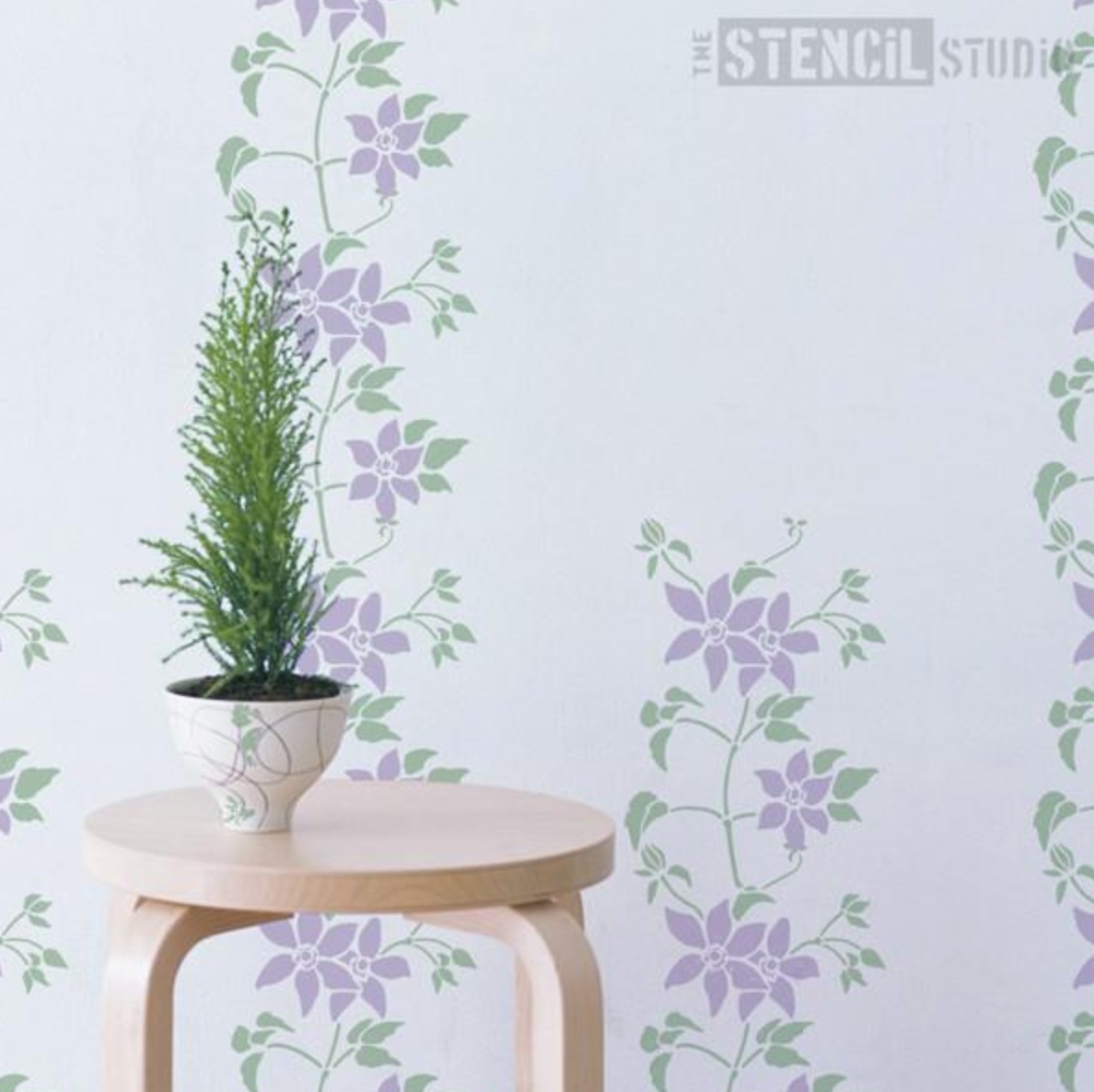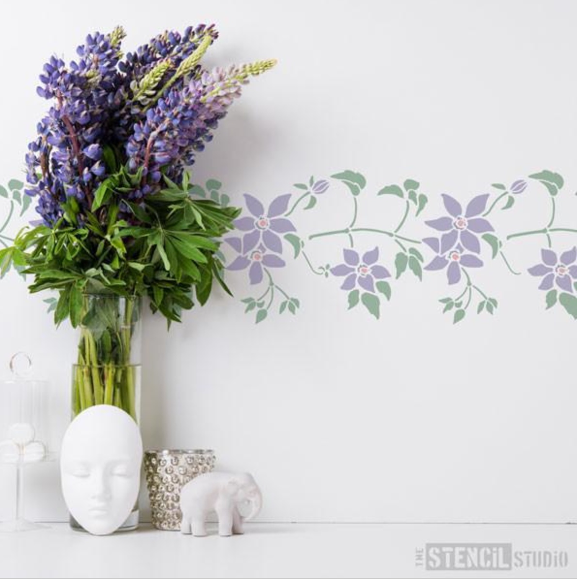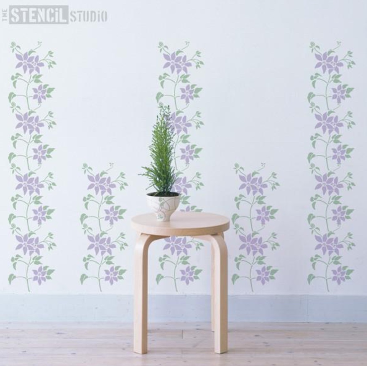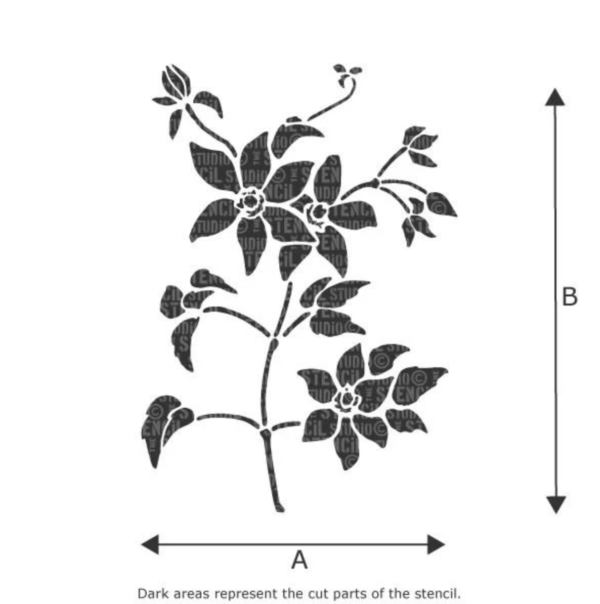 Ein schöner Clematis-Zweig mit Blüten und Blättern. Die wiederverwendbare lasergeschnittene Clematis-Schablone verleiht jeder Einrichtung Landhauscharme.