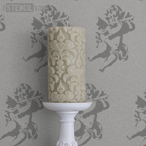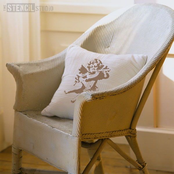 Auf dieser Schablone ist ein schöner flötenspielender Engel zu sehen.
