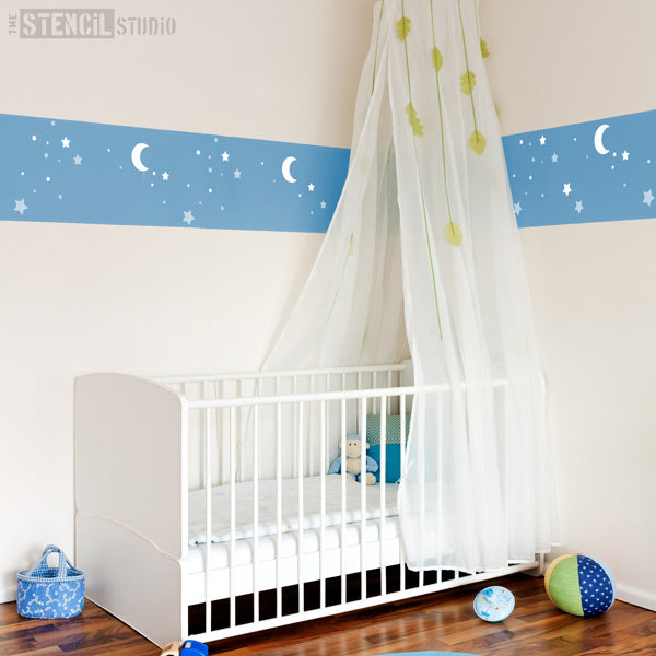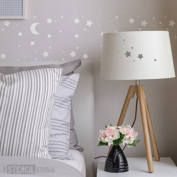 Schablone mit Mond und einer Sammlung von kleinen Sternen. Malen Sie Ihren eigenen Nachthimmel, um ein schönes und ruhiges Zimmer für Ihr Kind zu schaffen.