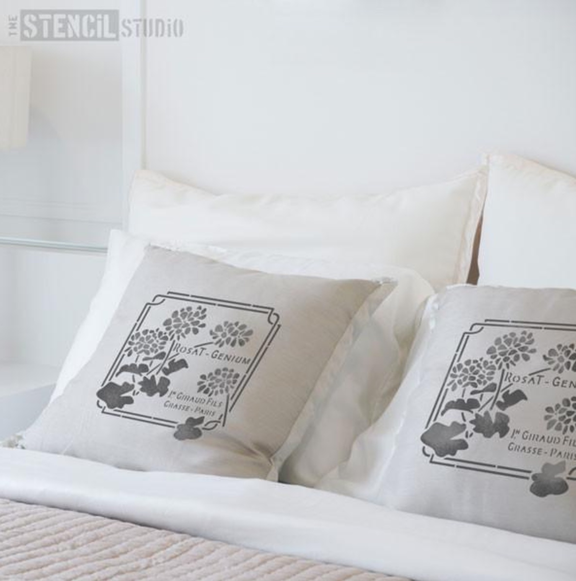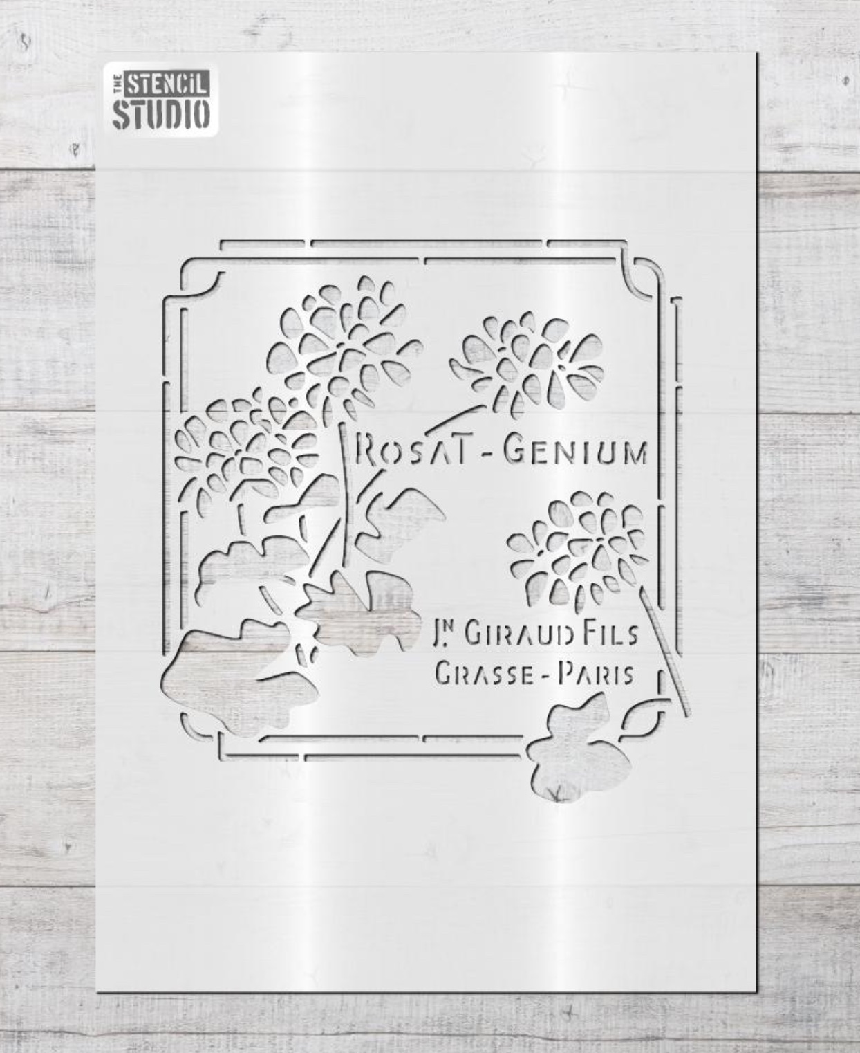 Wunderschöne Schablone für Parfümetiketten mit französischen Geranien. Ideal für Shabby Chic diy Projekte.