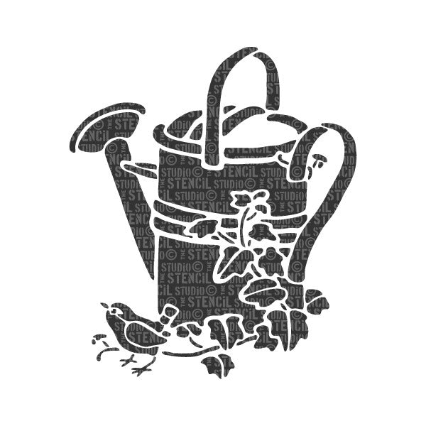 Klassische Gießkanne, Efeublätter und ein kleiner Zaunkönig sind auf dieser entzückenden Schablone zu sehen.