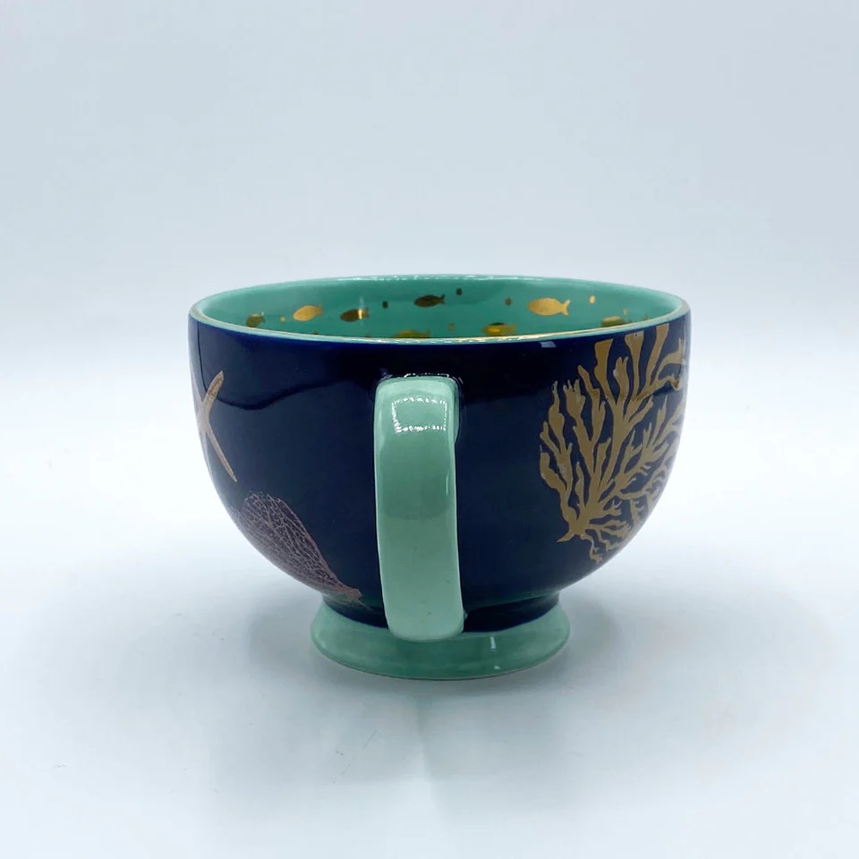 Die Außenseite der Tasse zeigt eine farbenfrohe Meereslandschaft mit einem Goldrand für zusätzlichen Luxus.