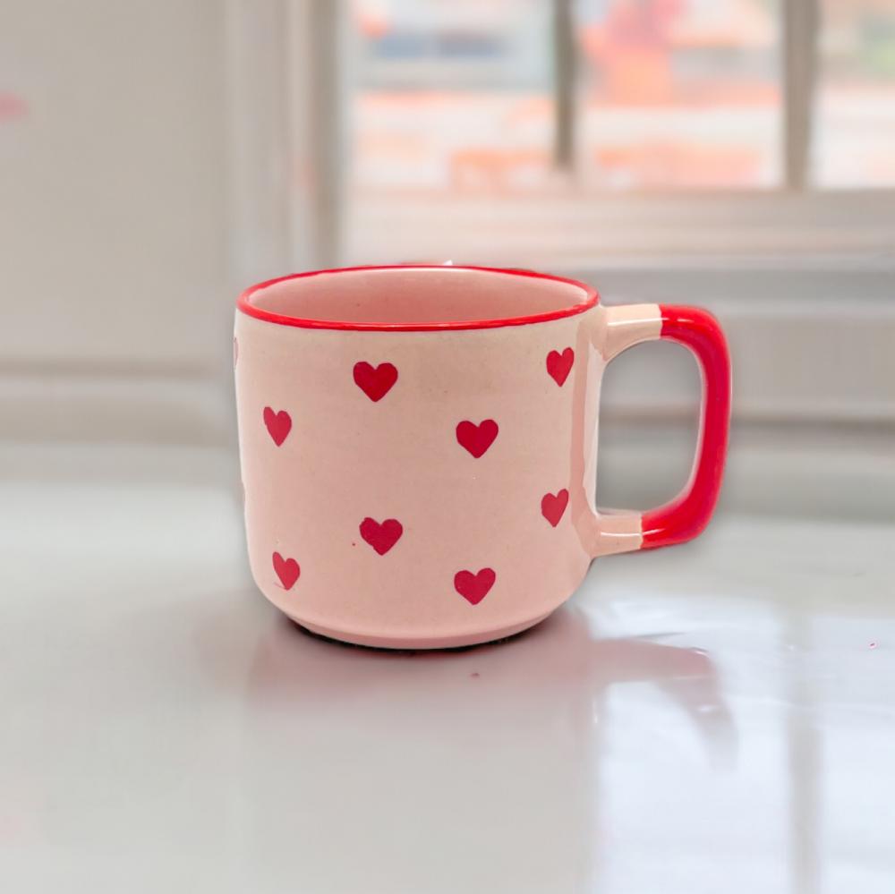 Die apricotfarbene Tasse ist liebevoll von Hand hergestellt, jedes Herz ist einzeln aufgemalt! Kleine Details wie die Innenfarbe der Tasse und der farblich abgesetzte Henkel machen diese Herztasse zu einem besonderen Accessoire, das man gerne in der Hand hält.