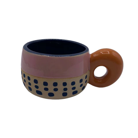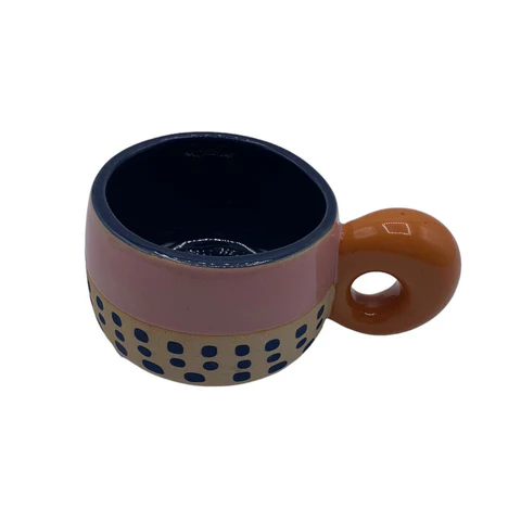 Dank der Handarbeit ist jede Tasse ein Unikat, und kleine Unregelmäßigkeiten machen den besonderen Charme aus. Der ausgefallene, donutförmige Henkel sorgt für ein bequemes Greifen und bringt Freude in jede Kaffeepause.