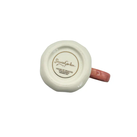 Der cremefarbene Hintergrund, der rosa Henkel und die goldenen Akzente an Blüten und Rand verleihen der Tasse einen besonderen Glanz. Innen ist sie mit einer rosa Glasur versehen.