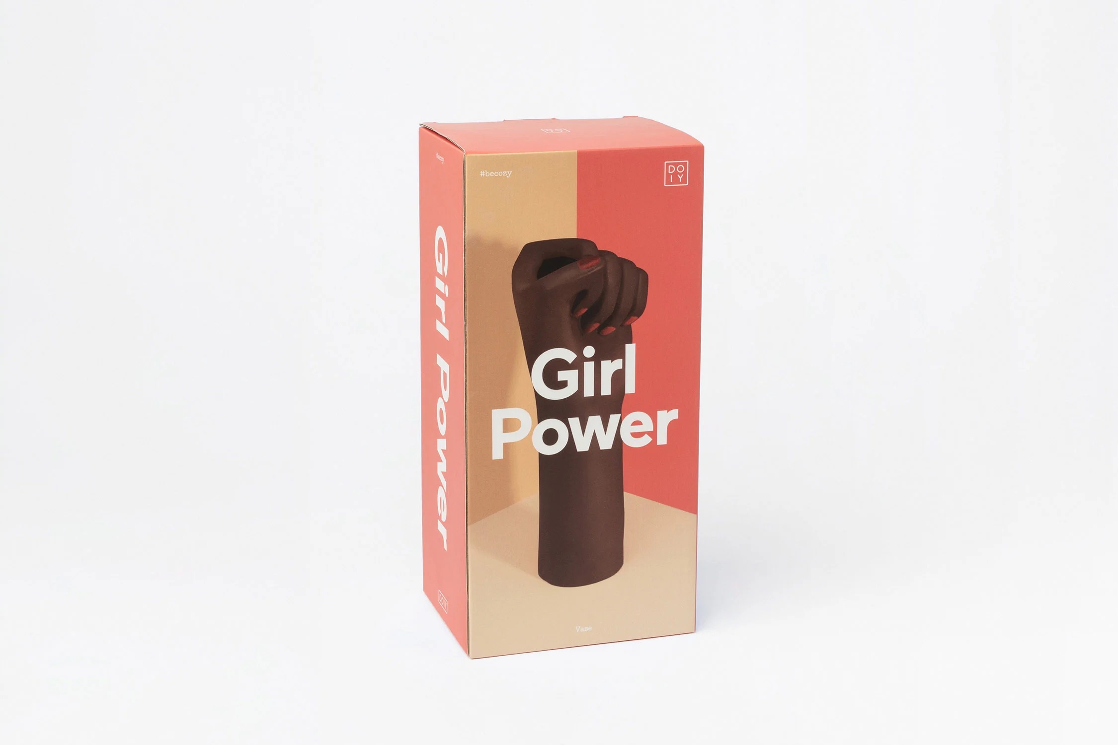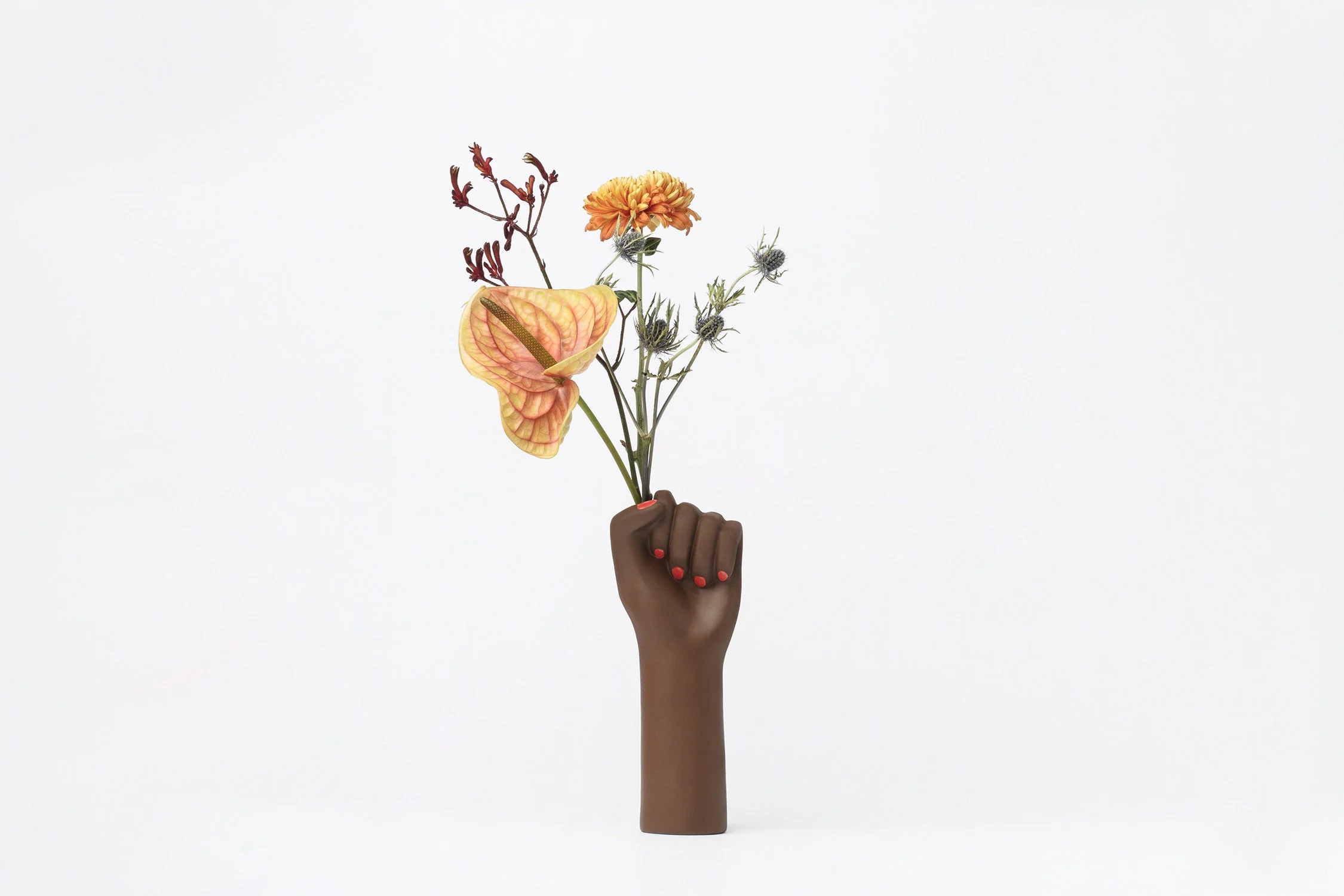 Modernes Keramikgefäß mit matter Oberfläche in Form einer kämpfenden Frauenhand, mit rot lackierten Nägeln.