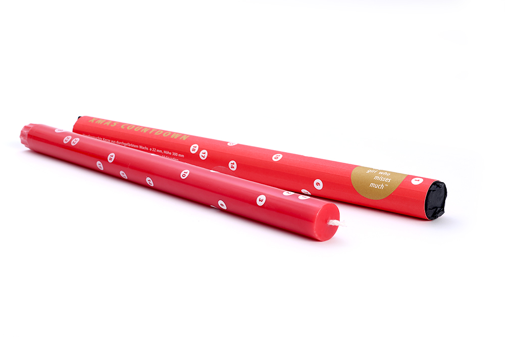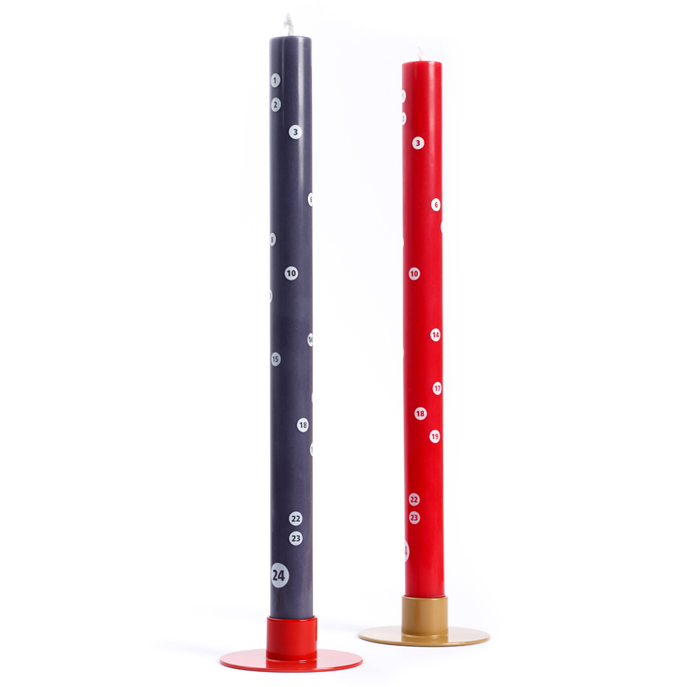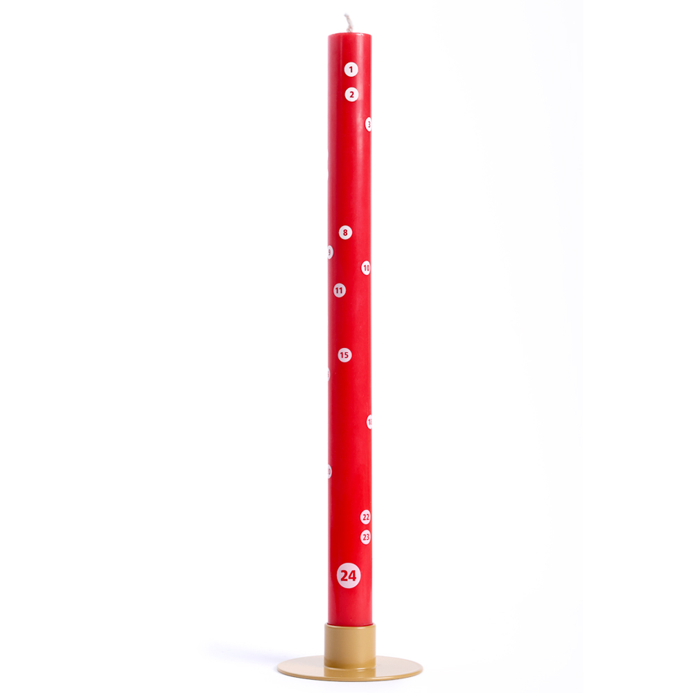 Die extralange, von Hand gegossene Kerze aus durchgefärbtem Wachs ist runderherum mit Zahlen von 1-24 bedruckt.