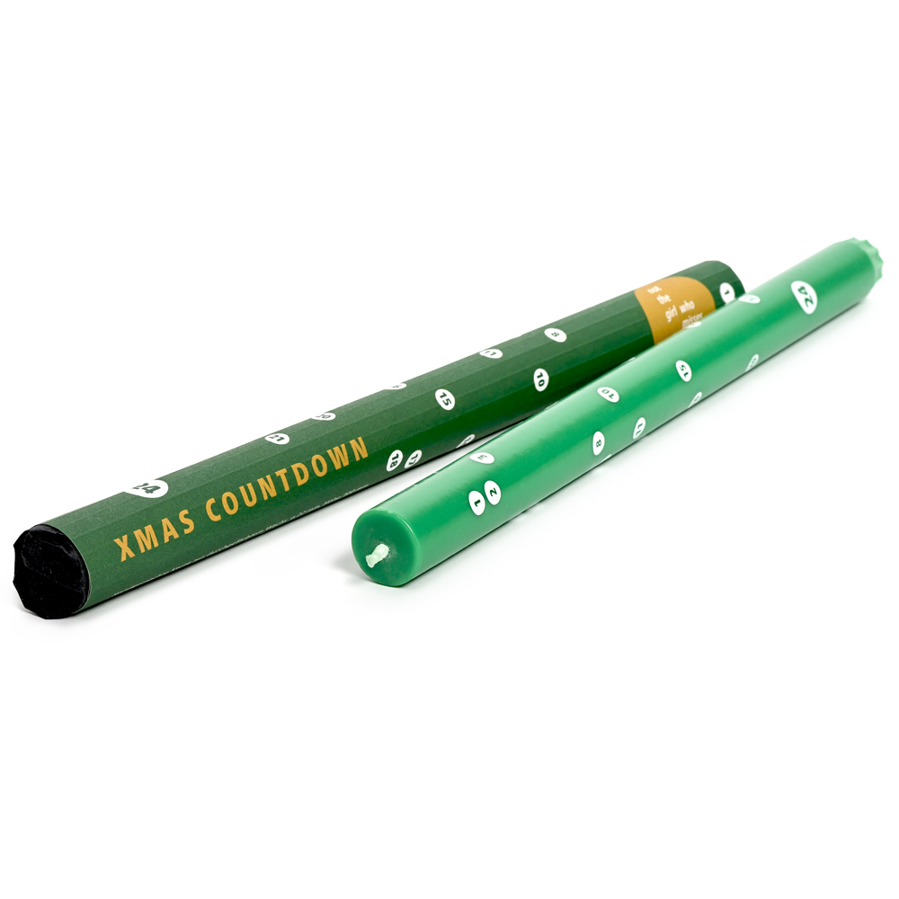 Die extralange, von Hand gegossene Kerze aus durchgefärbtem Wachs ist runderherum mit Zahlen von 1-24 bedruckt.