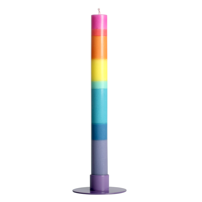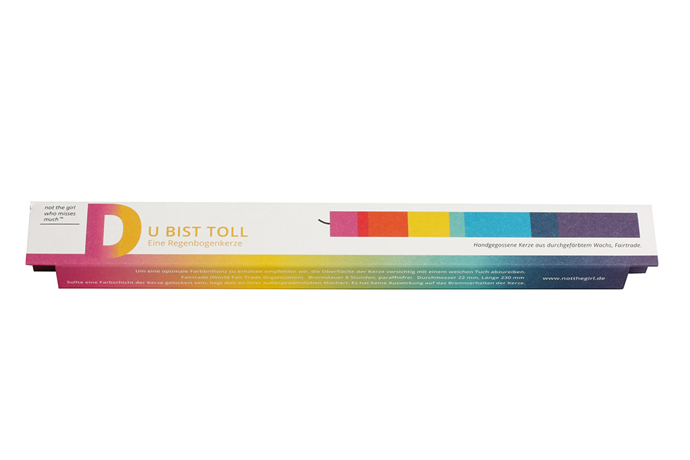 Mehrfarbige Kerze mit Botschaft. Als Geschenk, Glückwunsch oder als Gruß einzeln in farbiger Kartonage verpackt. Die Kerze ist aus durchgefärbtem Wachs, bei der Fertigung wird Farbschicht für Farbschicht von Hand gegossen.