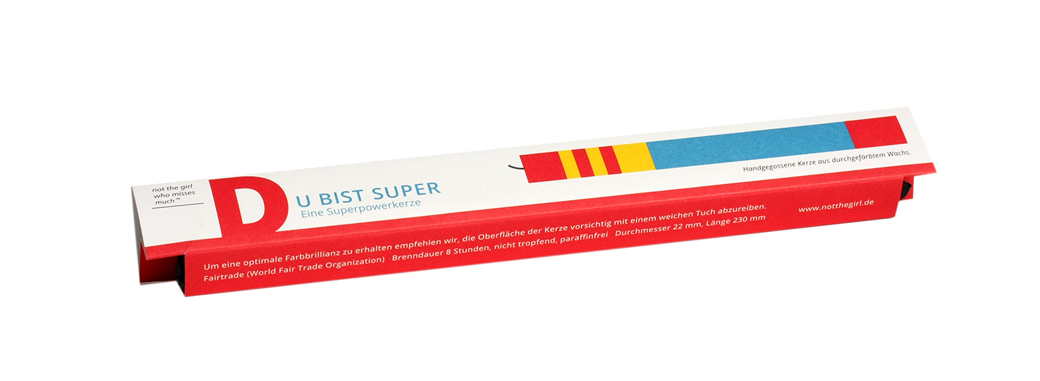 Mehrfarbige Kerze mit Botschaft. Als Geschenk, Glückwunsch oder als Gruß einzeln in farbiger Kartonage verpackt. Die Kerze ist aus durchgefärbtem Wachs, bei der Fertigung wird Farbschicht für Farbschicht von Hand gegossen.