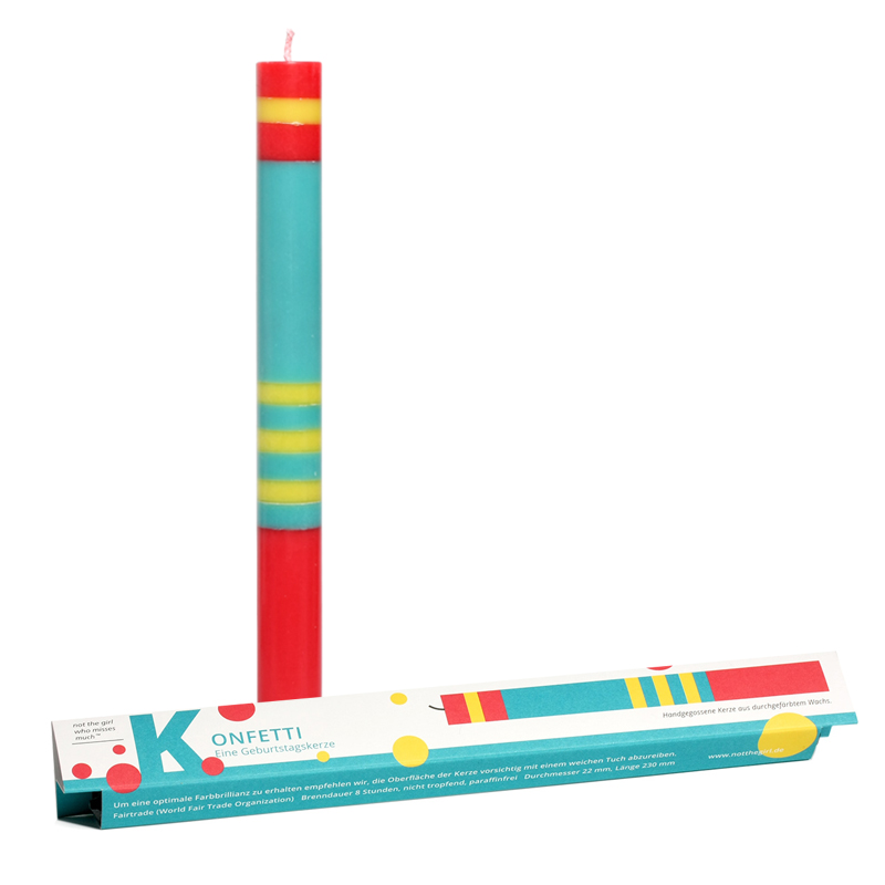 Mehrfarbige Kerze mit Botschaft. Als Geschenk, Glückwunsch oder als Gruß einzeln in farbiger Kartonage verpackt. Die Kerze ist aus durchgefärbtem Wachs, bei der Fertigung wird Farbschicht für Farbschicht von Hand gegossen.