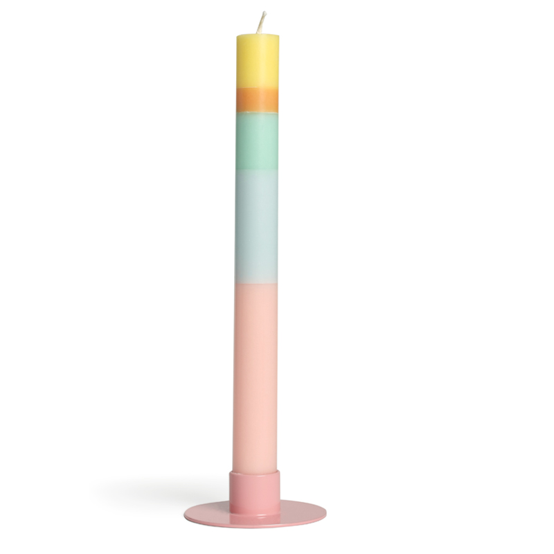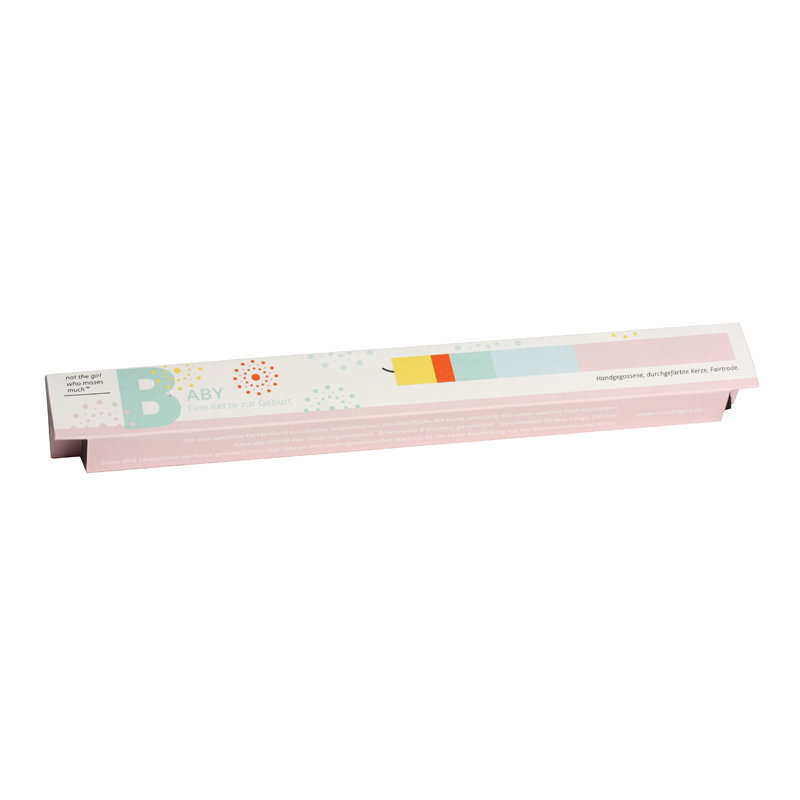 Mehrfarbige Kerze mit Botschaft. Als Geschenk, Glückwunsch oder als Gruß einzeln in farbiger Kartonage verpackt. Die Kerze ist aus durchgefärbtem Wachs, bei der Fertigung wird Farbschicht für Farbschicht von Hand gegossen.