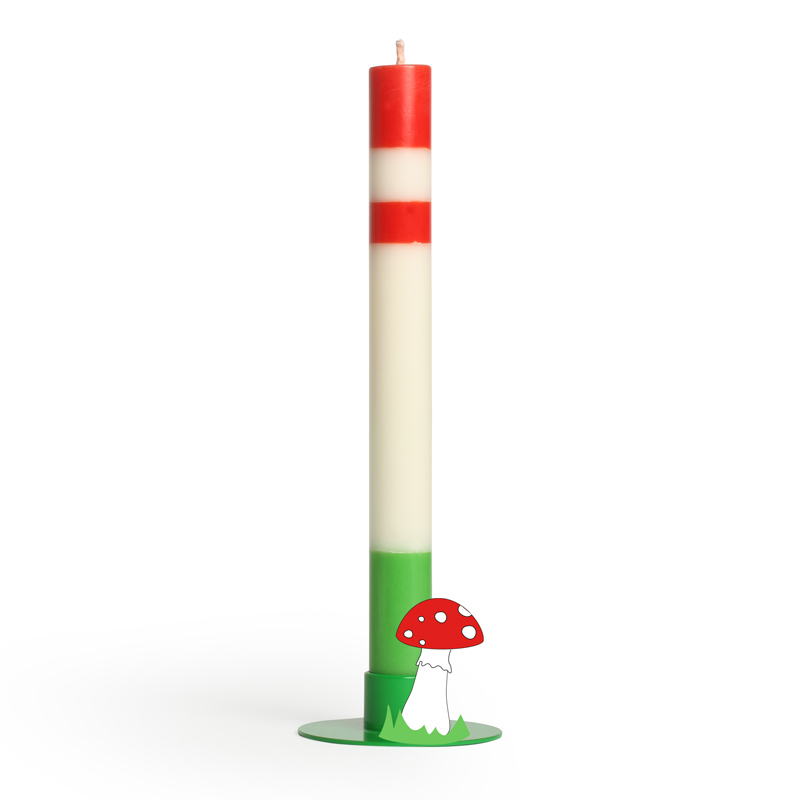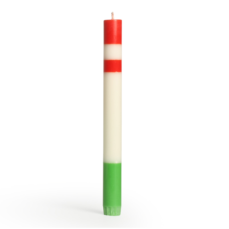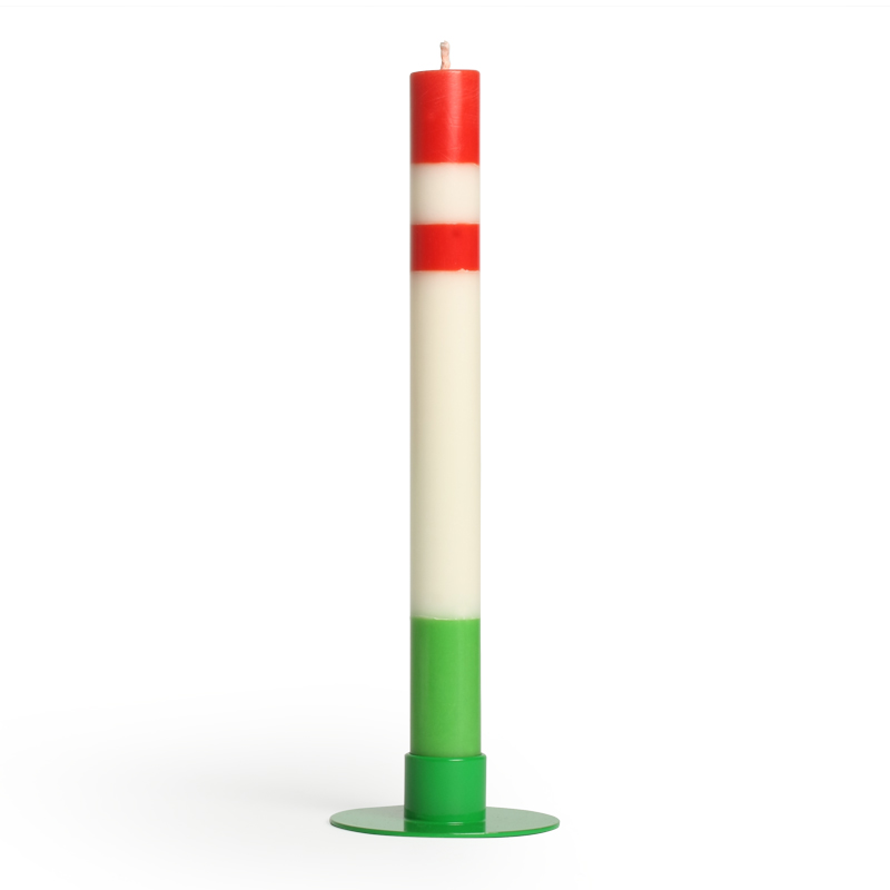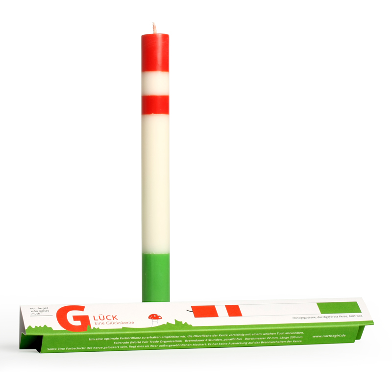 Mehrfarbige Kerze mit Botschaft. Als Geschenk, Glückwunsch oder als Gruß einzeln in farbiger Kartonage verpackt. Die Kerze ist aus durchgefärbtem Wachs, bei der Fertigung wird Farbschicht für Farbschicht von Hand gegossen.