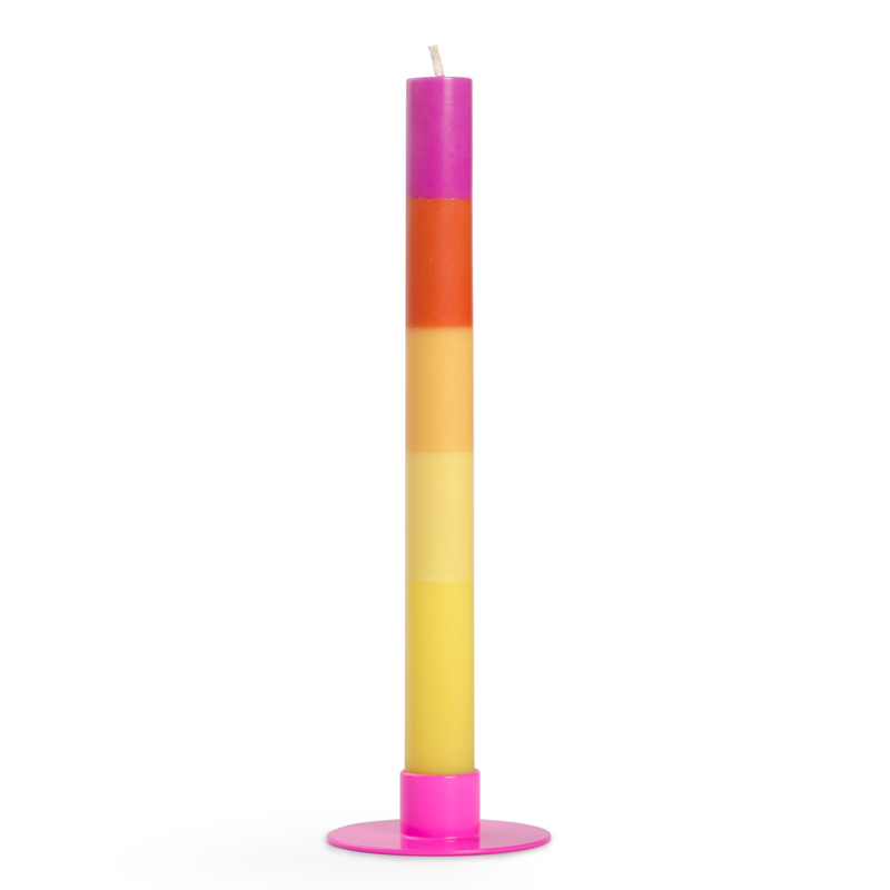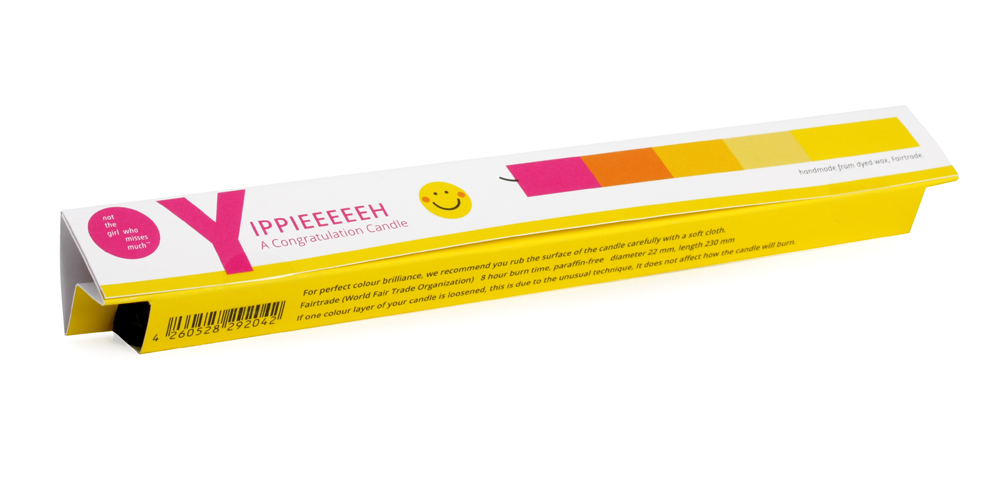 Mehrfarbige Kerze mit Botschaft. Als Geschenk, Glückwunsch oder als Gruß einzeln in farbiger Kartonage verpackt. Die Kerze ist aus durchgefärbtem Wachs, bei der Fertigung wird Farbschicht für Farbschicht von Hand gegossen.