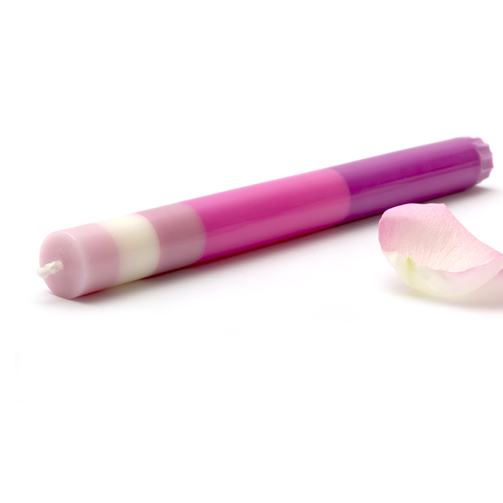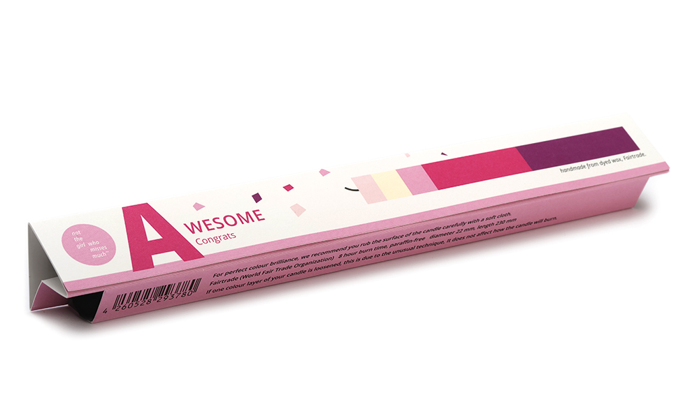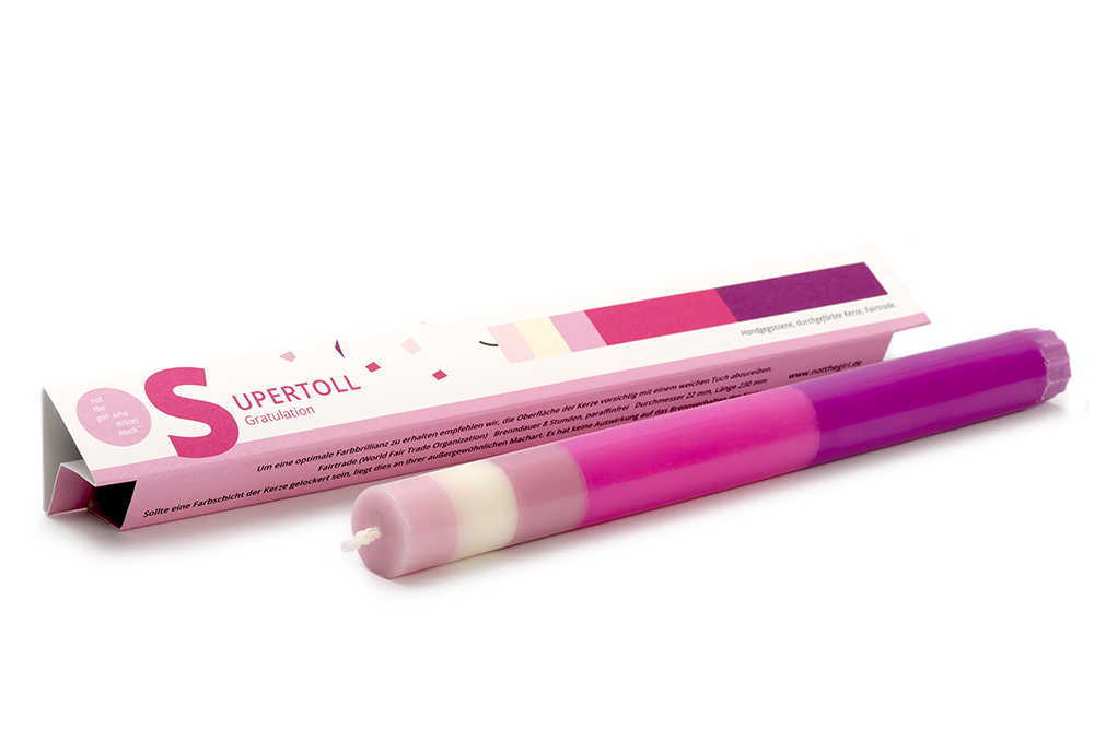 Mehrfarbige Kerze mit Botschaft. Als Geschenk, Glückwunsch oder als Gruß einzeln in farbiger Kartonage verpackt. Die Kerze ist aus durchgefärbtem Wachs, bei der Fertigung wird Farbschicht für Farbschicht von Hand gegossen.