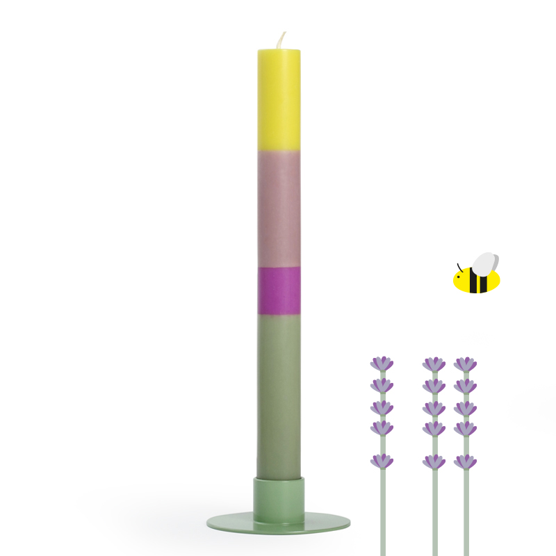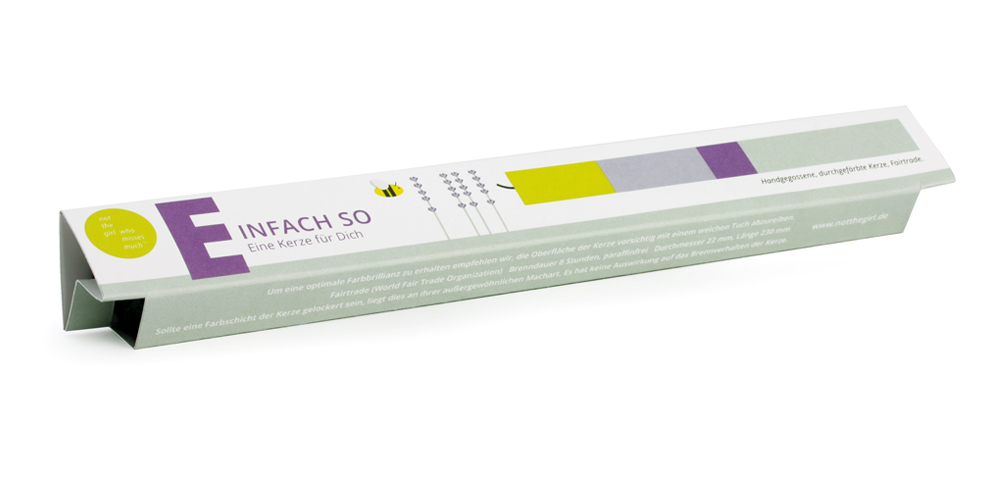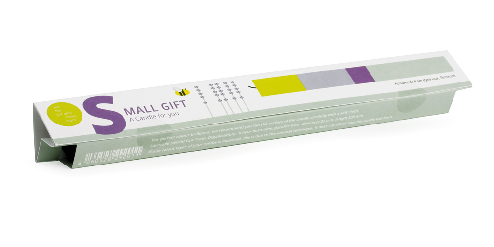Mehrfarbige Kerze mit Botschaft. Als Geschenk, Glückwunsch oder als Gruß einzeln in farbiger Kartonage verpackt. Die Kerze ist aus durchgefärbtem Wachs, bei der Fertigung wird Farbschicht für Farbschicht von Hand gegossen.