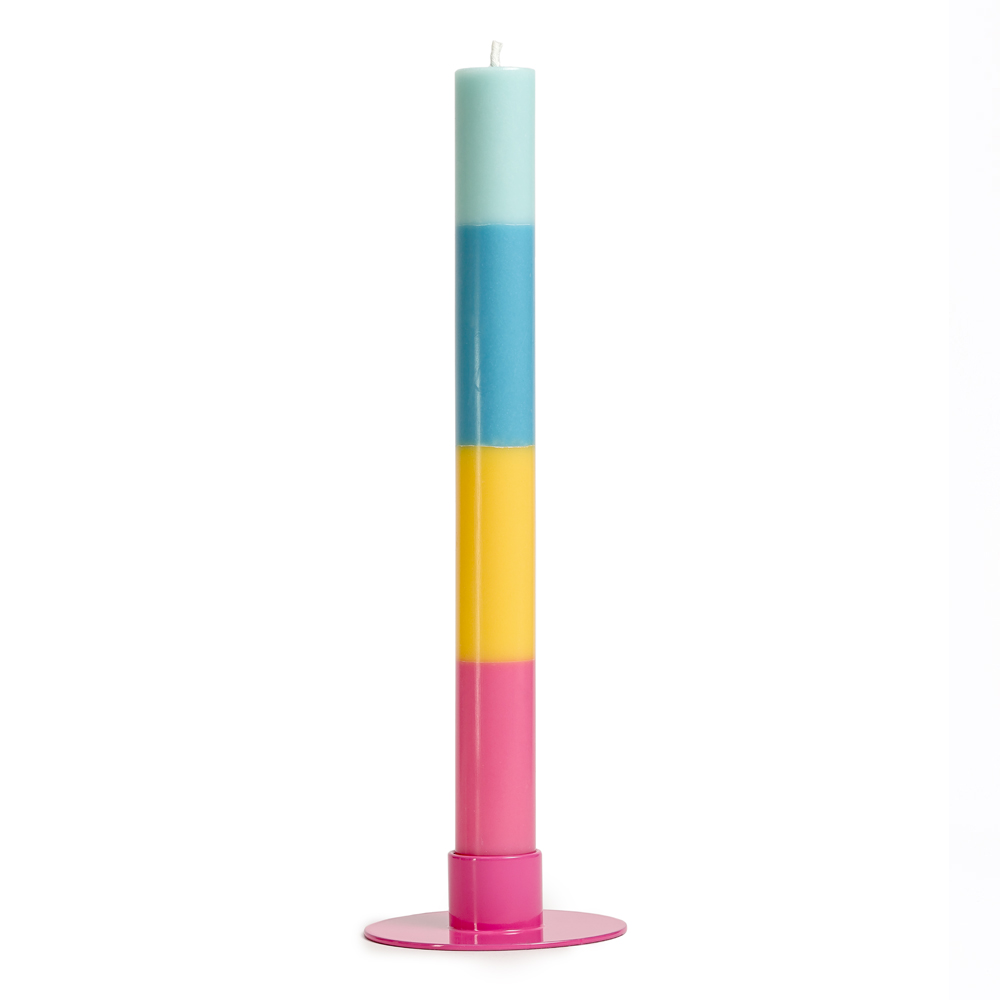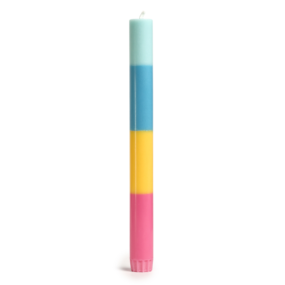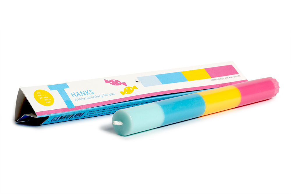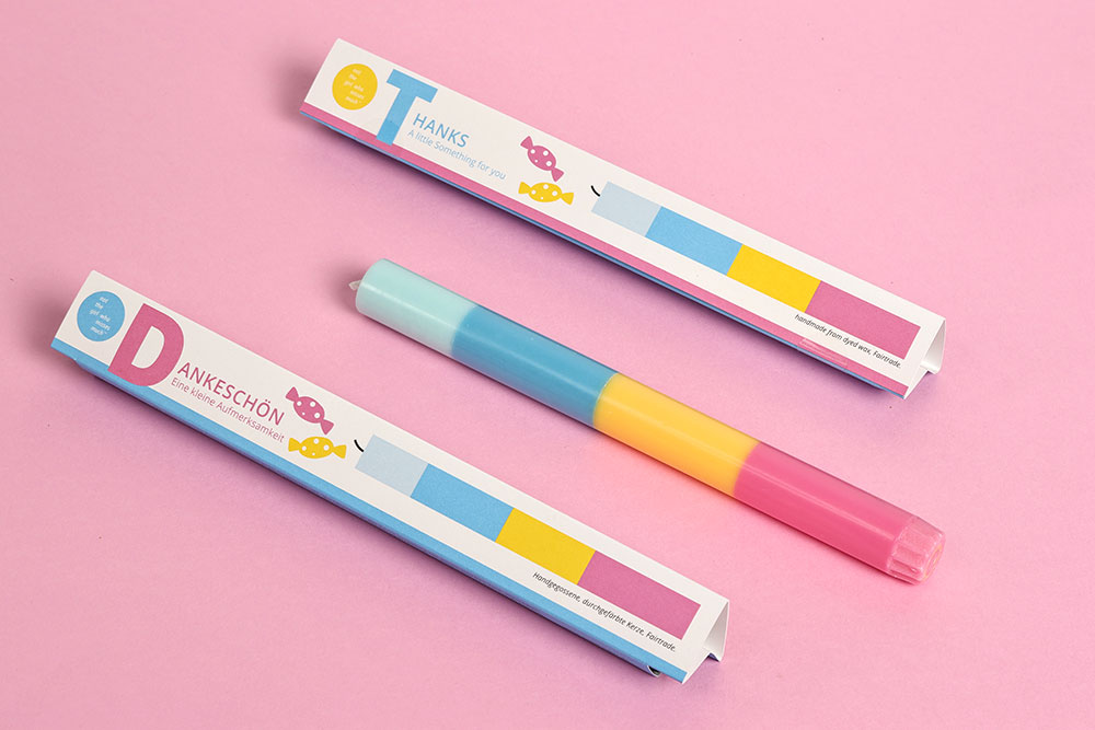 Mehrfarbige Kerze mit Botschaft. Als Geschenk, Glückwunsch oder als Gruß einzeln in farbiger Kartonage verpackt. Die Kerze ist aus durchgefärbtem Wachs, bei der Fertigung wird Farbschicht für Farbschicht von Hand gegossen.