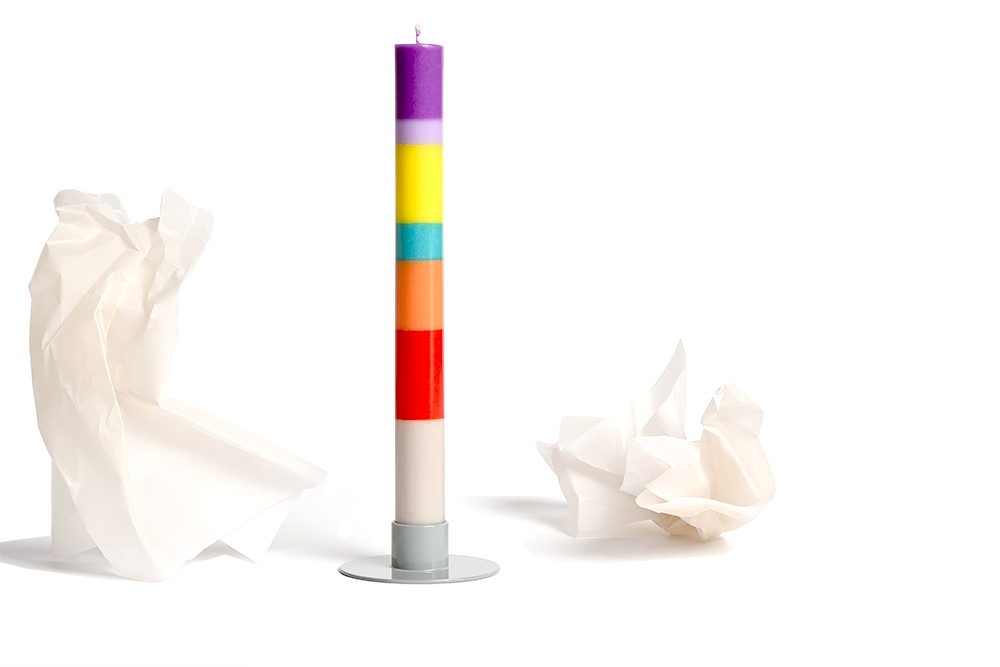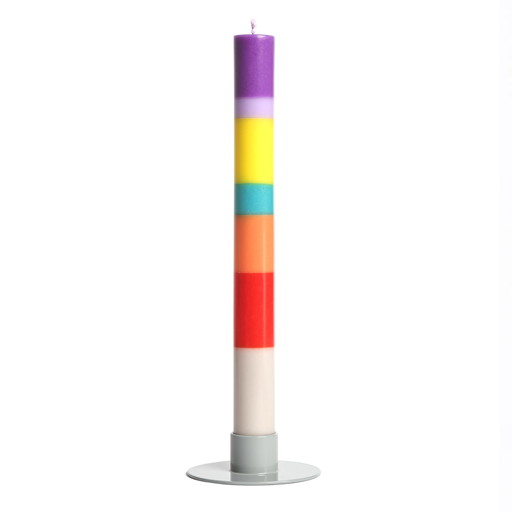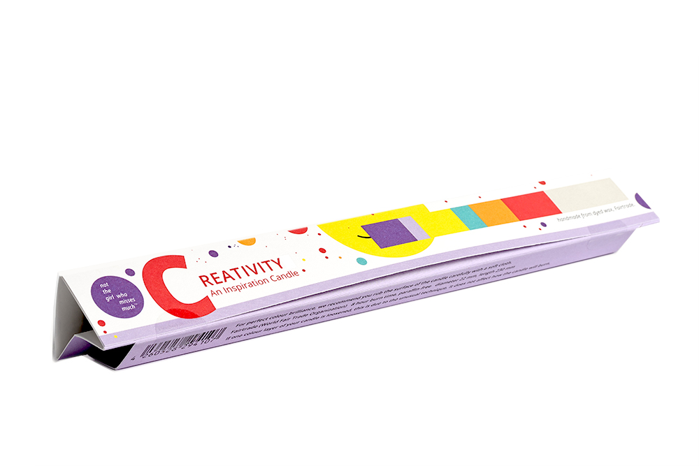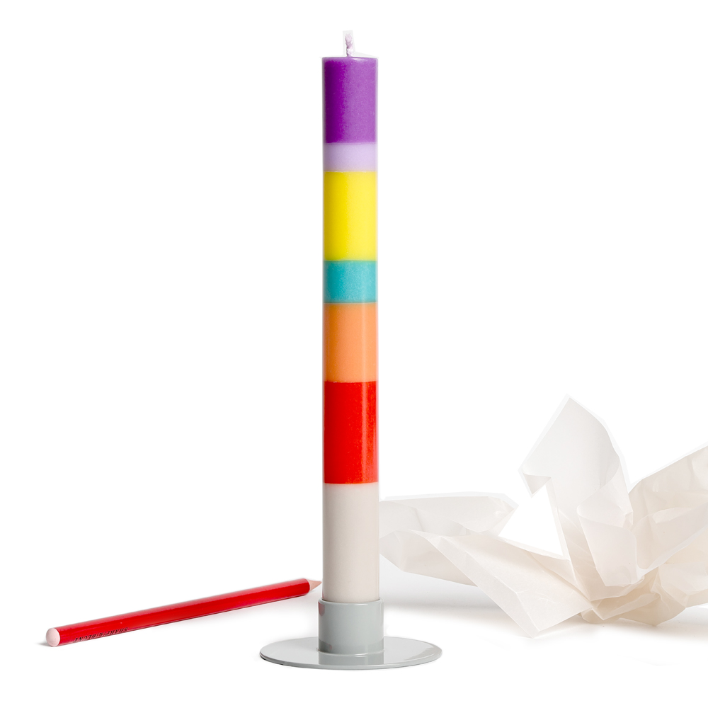 Mehrfarbige Kerze mit Botschaft. Als Geschenk, Glückwunsch oder als Gruß einzeln in farbiger Kartonage verpackt. Die Kerze ist aus durchgefärbtem Wachs, bei der Fertigung wird Farbschicht für Farbschicht von Hand gegossen.