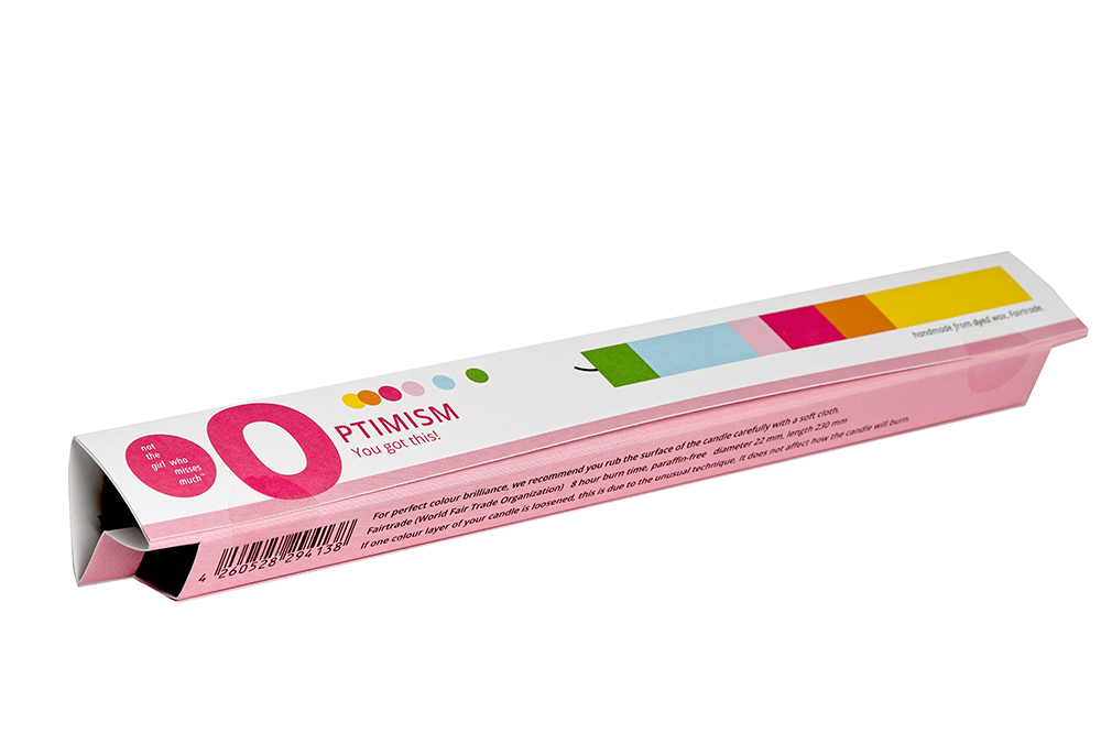 Mehrfarbige Kerze mit Botschaft. Als Geschenk, Glückwunsch oder als Gruß einzeln in farbiger Kartonage verpackt. Die Kerze ist aus durchgefärbtem Wachs, bei der Fertigung wird Farbschicht für Farbschicht von Hand gegossen.