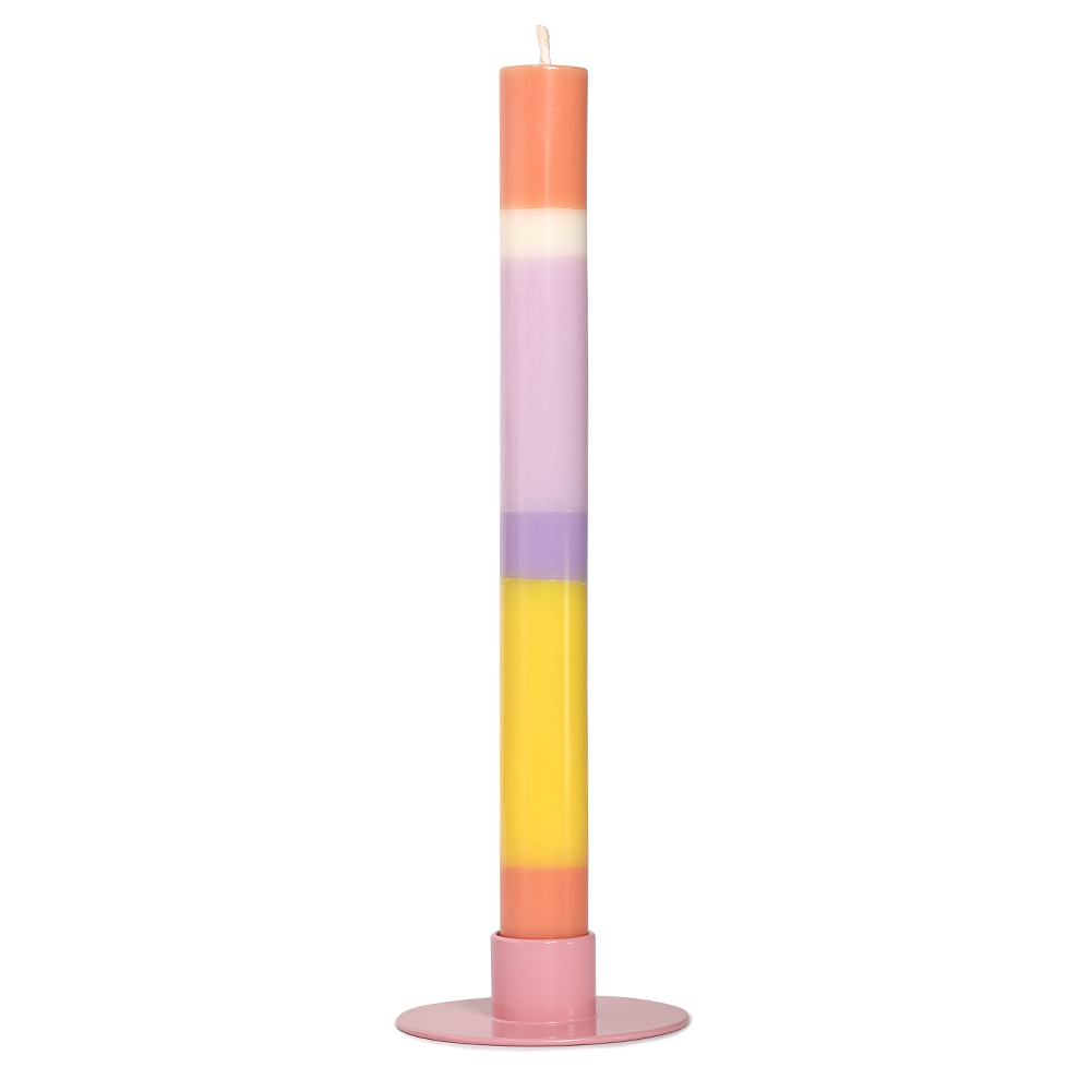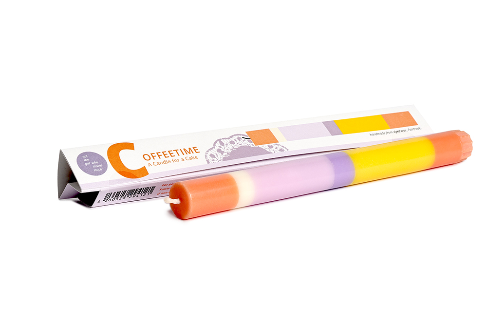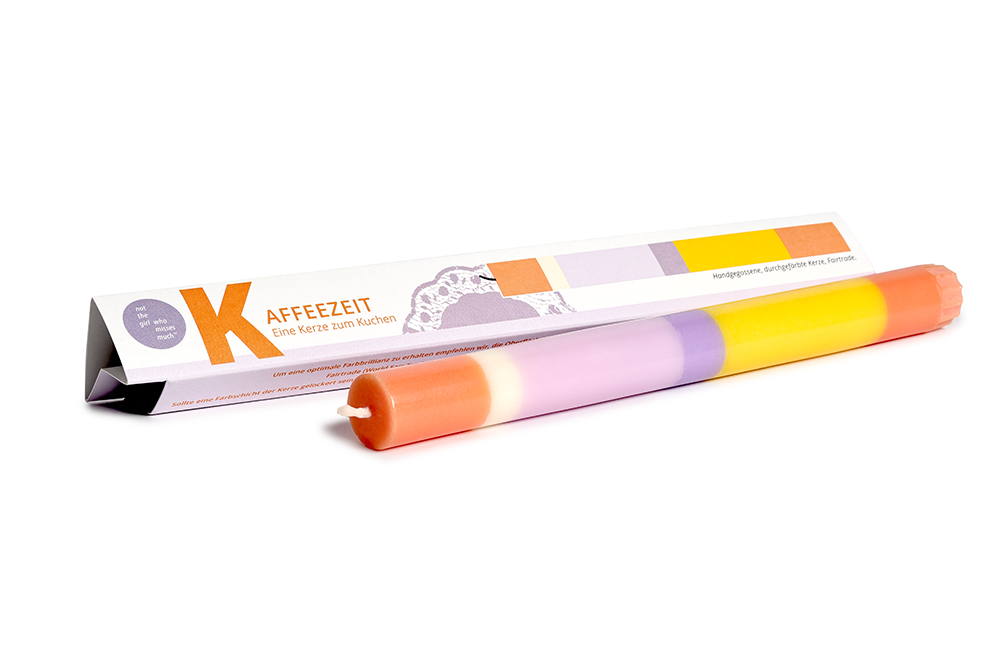 Mehrfarbige Kerze mit Botschaft. Als Geschenk, Glückwunsch oder als Gruß einzeln in farbiger Kartonage verpackt. Die Kerze ist aus durchgefärbtem Wachs, bei der Fertigung wird Farbschicht für Farbschicht von Hand gegossen.