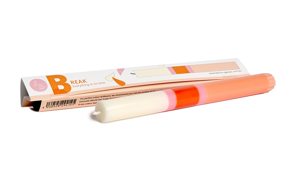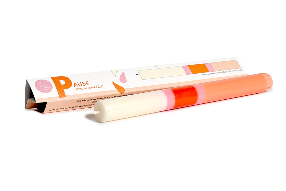 Mehrfarbige Kerze mit Botschaft. Als Geschenk, Glückwunsch oder als Gruß einzeln in farbiger Kartonage verpackt. Die Kerze ist aus durchgefärbtem Wachs, bei der Fertigung wird Farbschicht für Farbschicht von Hand gegossen.