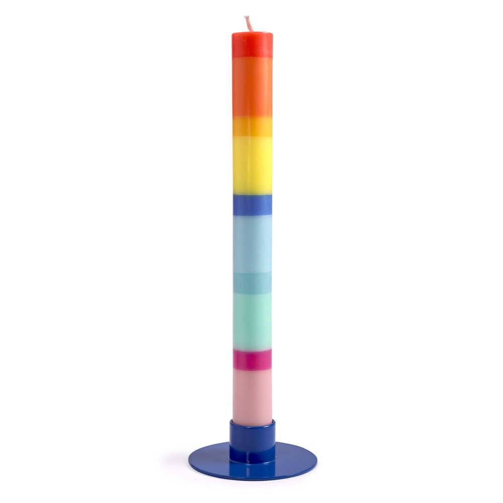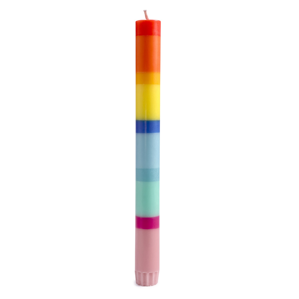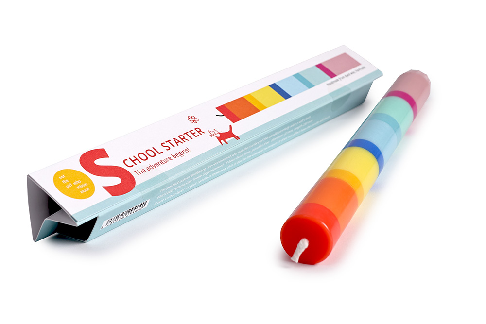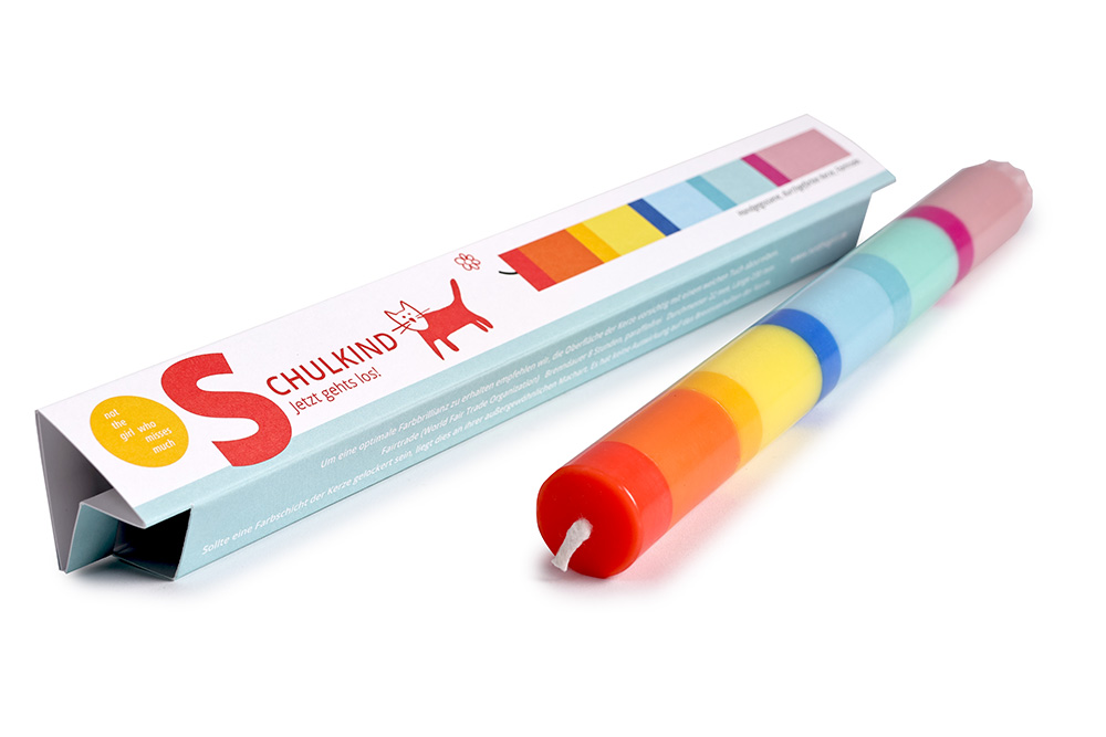 Mehrfarbige Kerze mit Botschaft. Als Geschenk, Glückwunsch oder als Gruß einzeln in farbiger Kartonage verpackt. Die Kerze ist aus durchgefärbtem Wachs, bei der Fertigung wird Farbschicht für Farbschicht von Hand gegossen.