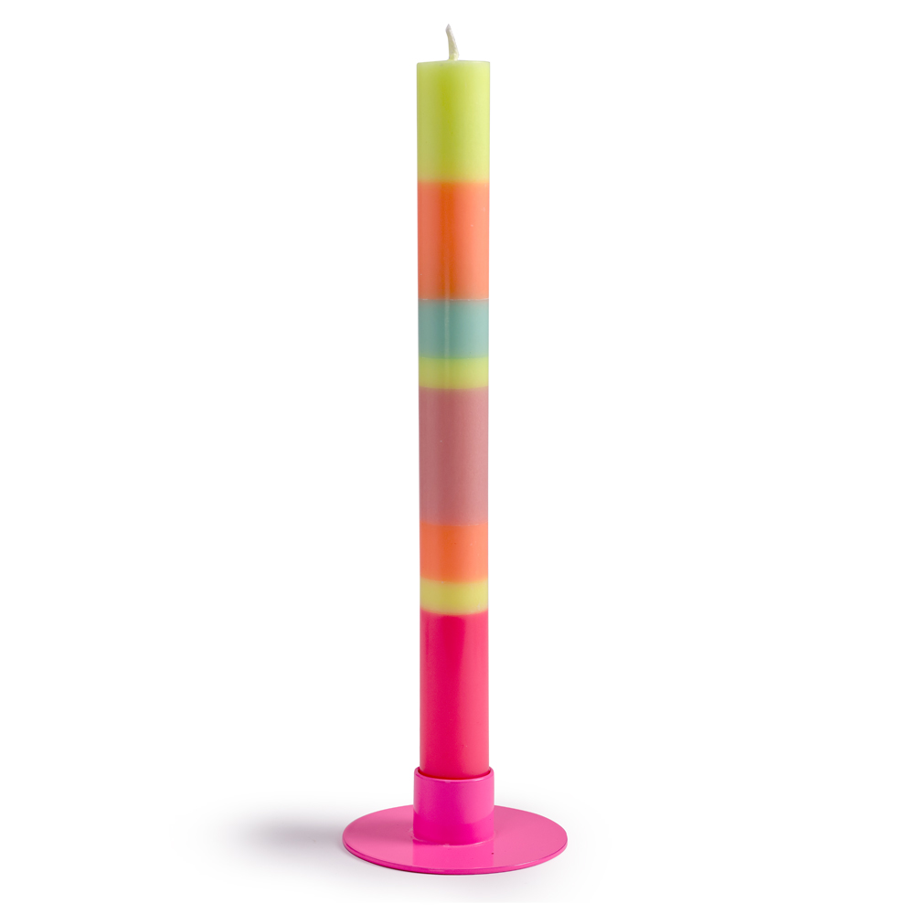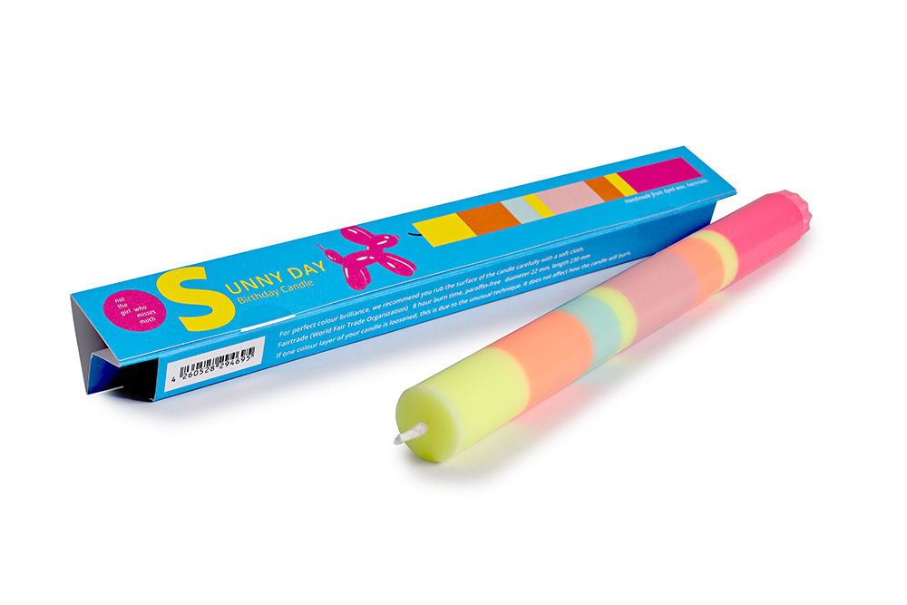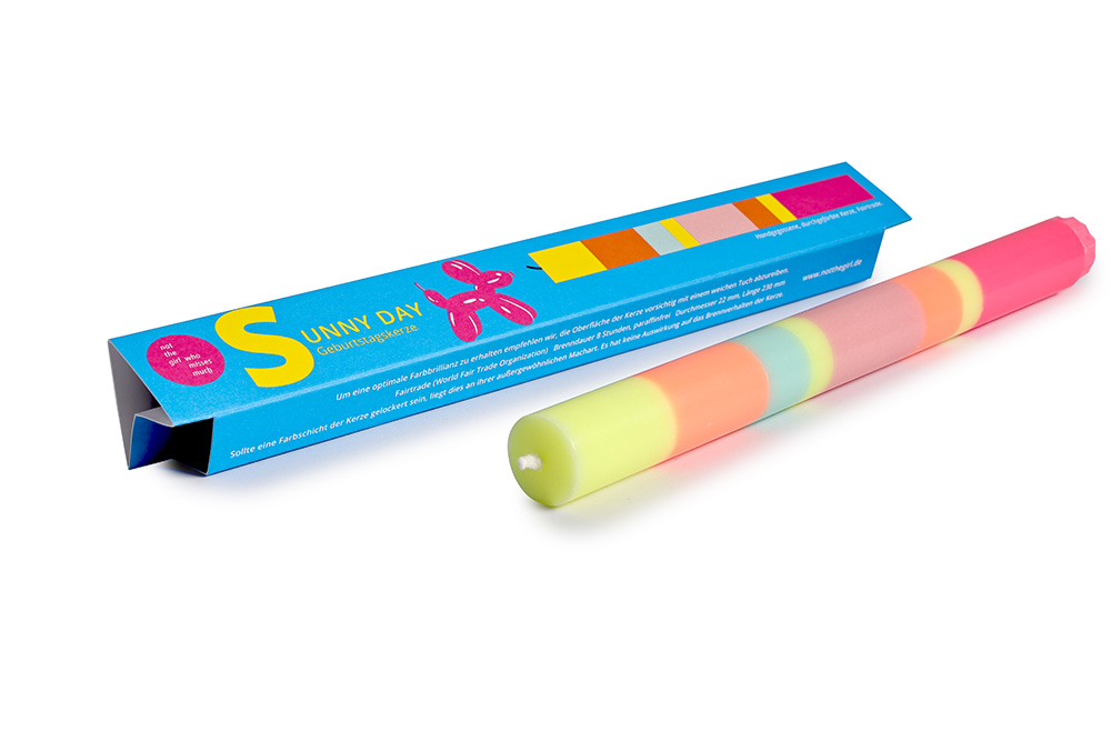 Mehrfarbige Kerze mit Botschaft. Als Geschenk, Glückwunsch oder als Gruß einzeln in farbiger Kartonage verpackt. Die Kerze ist aus durchgefärbtem Wachs, bei der Fertigung wird Farbschicht für Farbschicht von Hand gegossen.