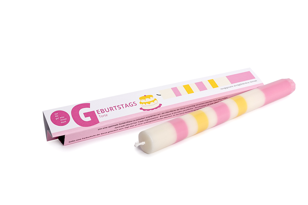 Gefertigt werden die Kerzen aus durchgefärbtem, pflanzlichem Stearin-Wachs in Handarbeit. Jede ist ein Unikat. Die Verpackung wird in Hamburg klimaneutral auf FSC-zertifiziertem Designpapier gedruckt – zweisprachig auf Deutsch und Englisch.