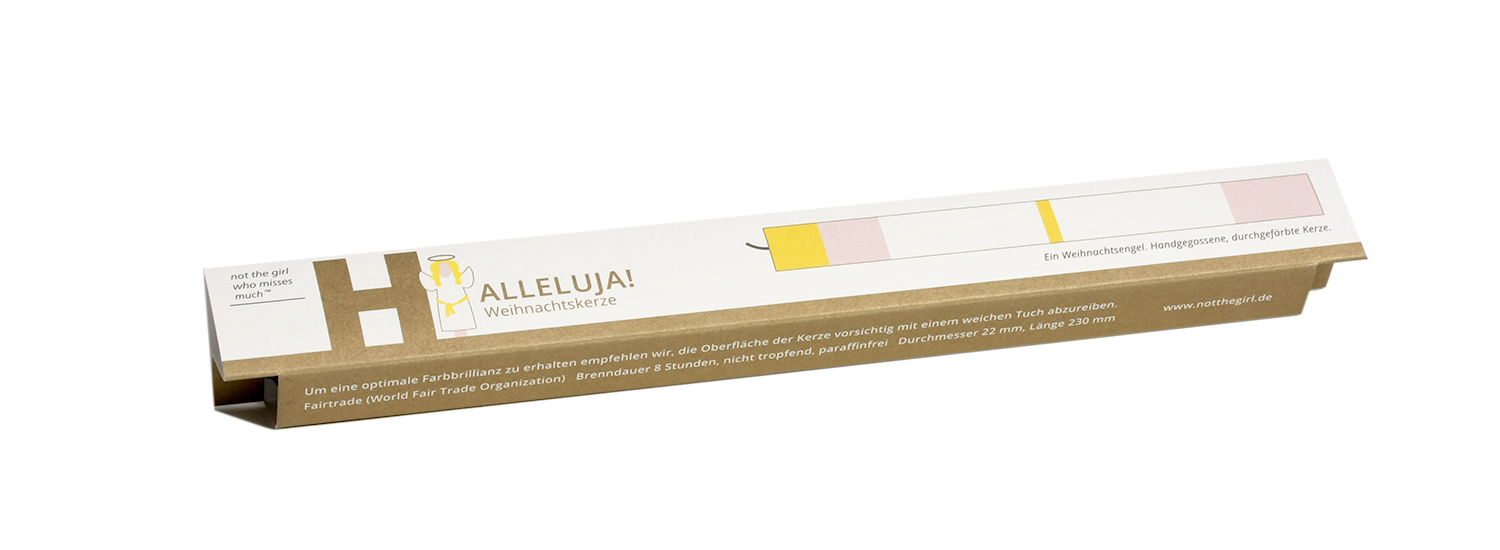 Gefertigt werden die Kerzen aus durchgefärbtem, pflanzlichem Stearin-Wachs in Handarbeit. Jede ist ein Unikat. Die Verpackung wird in Hamburg klimaneutral auf FSC-zertifiziertem Designpapier gedruckt – zweisprachig auf Deutsch und Englisch.