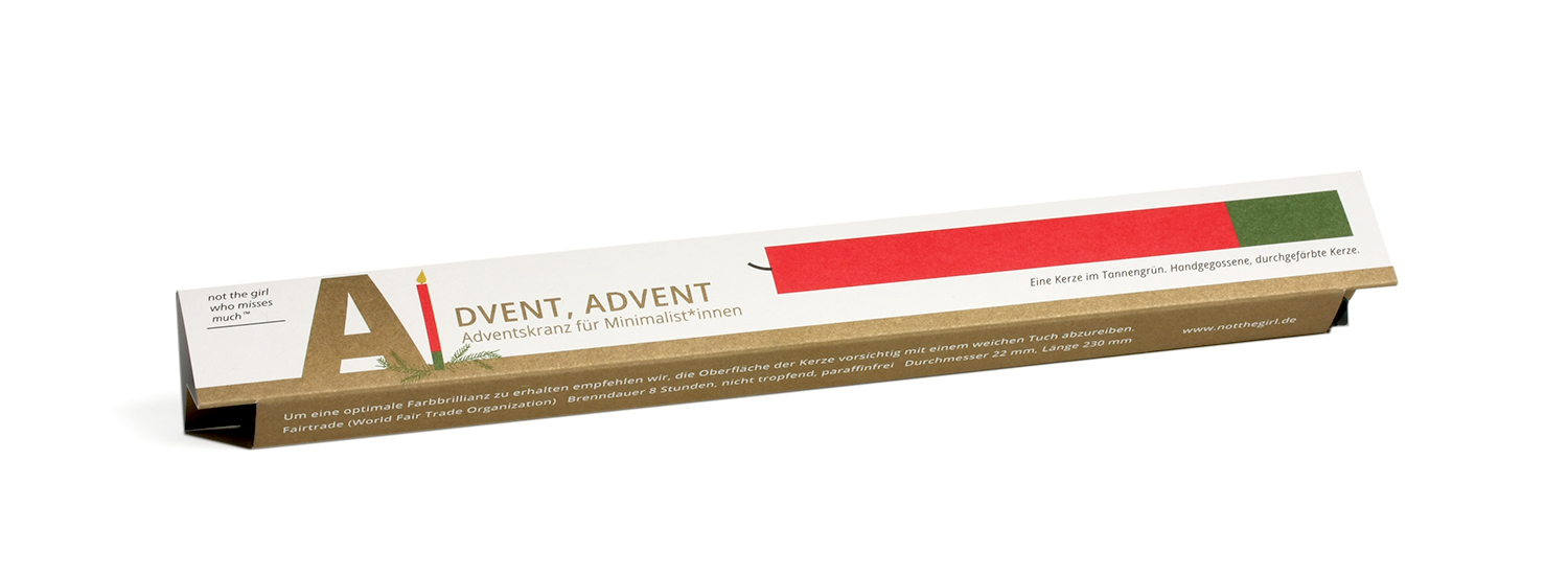 Minimalistisch und in brillianten Farben haben wir der Kerze einen Farbcode gegeben, der sich auf ganz unterschiedliche Themen des Lebens bezieht. So wird die Kerze zur Botschaft, zum Geschenk, überbringt Glückwunsche oder Grüße. Jedes Thema findet bei uns eine Kerze und jede Kerze ein neues Thema. Die Kerzen werden aus durchgefärbtem, pflanzlichen Wachs handgefertigt, die Verpackungen werden in Hamburg klimaneutral auf FSC zertifiziertem, offenen Designpapier gedruckt und weiterverarbeitet.