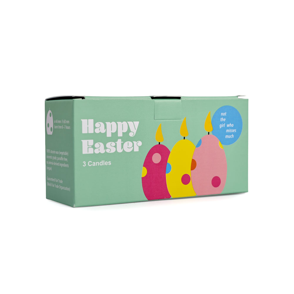 Drei Osterkerzen in leuchtendem Neongelb, Neonpink und Rosa. In jede Kerze sind von Hand bunte Punkte eingearbeit. Sie machen jede Kerze zu einem echten Unikat.