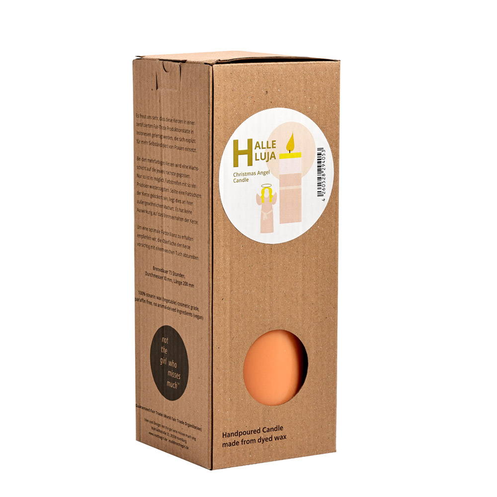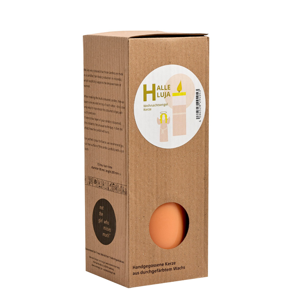 Wie gewohnt, kommt die große Kerze einzelverpackt in einem stabilen Naturkarton, zweisprachig in englisch und deutsch bedruckt.