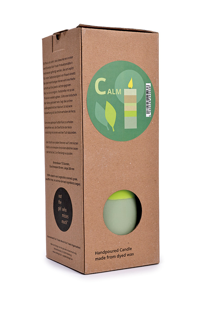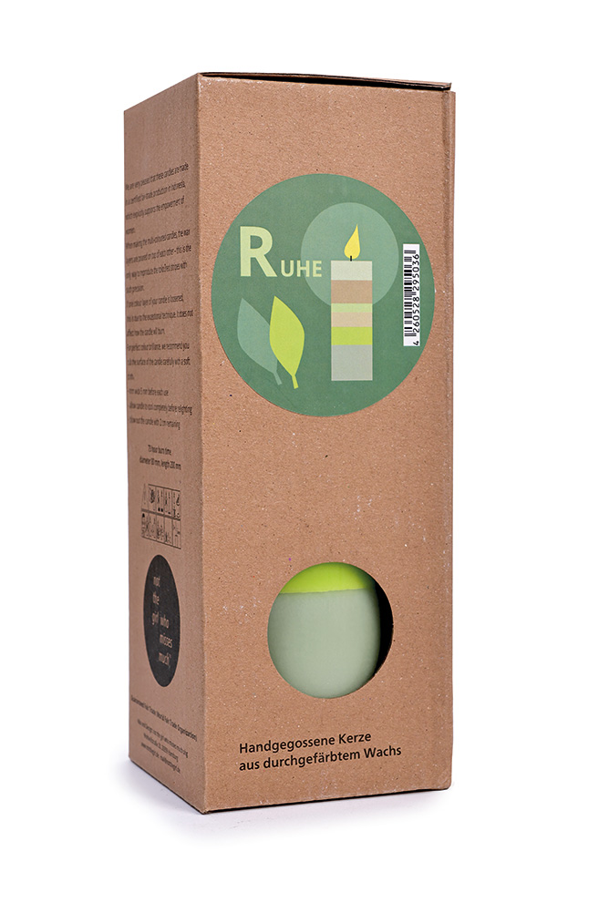 Gefertigt aus durchgefärbtem, pflanzlichem Stearin-Wachs in liebevoller Handarbeit. Jede Kerze ist ein Unikat. Verpackt ist sie in einem stabilen Naturkarton, klimaneutral bedruckt auf FSC-zertifiziertem Papier – zweisprachig auf Deutsch und Englisch.