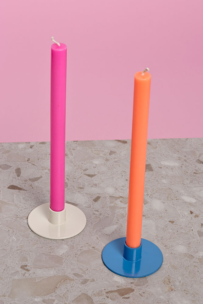 Der Kerzenhalter wird fast unsichtbar mit Kerzen derselben Farbe, erfreulich poppig hingegen in Kombination zu andersfarbigen Kerzen.
